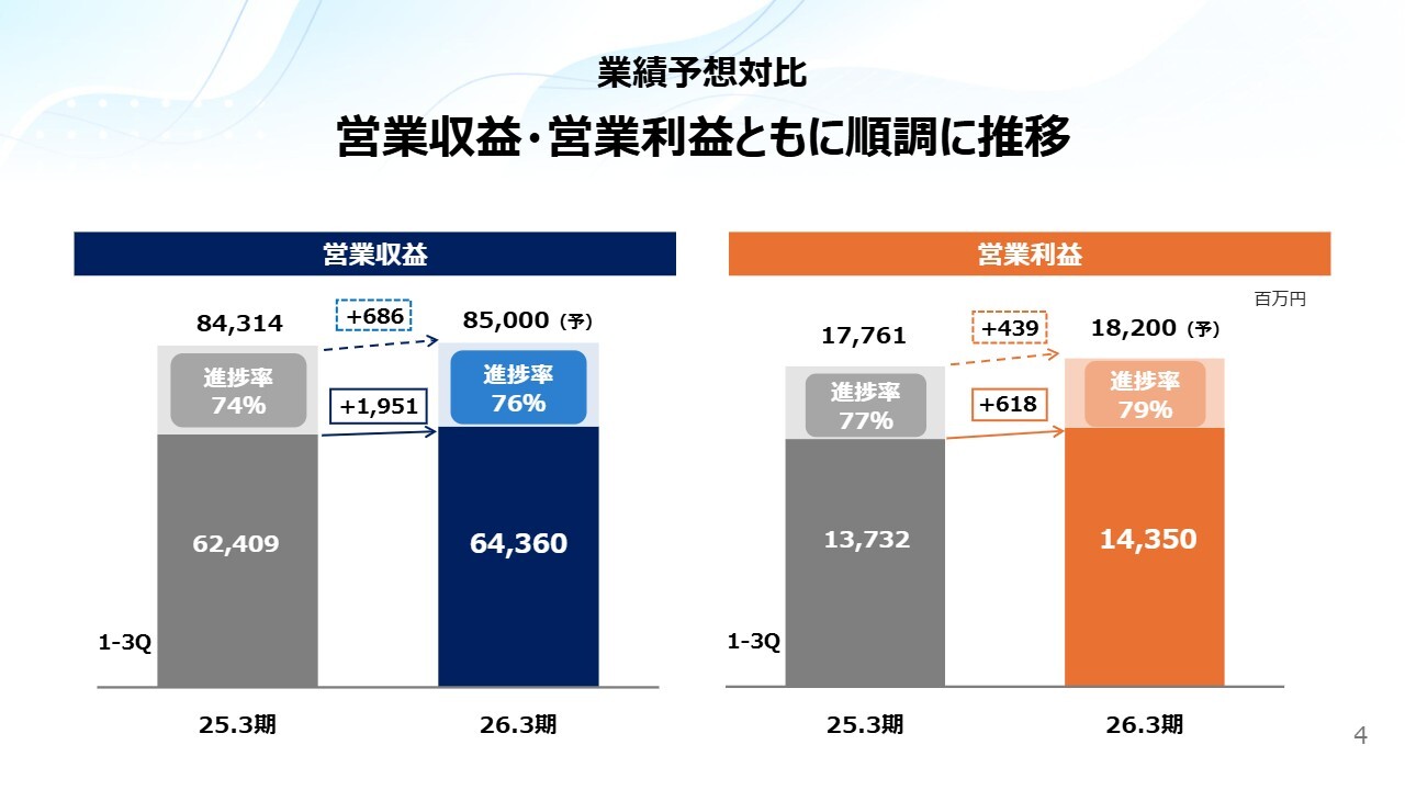 業績予想との対比です。スライド左側が営業収益、右側が営業利益を示しており、いずれも順調に進捗している状況です。