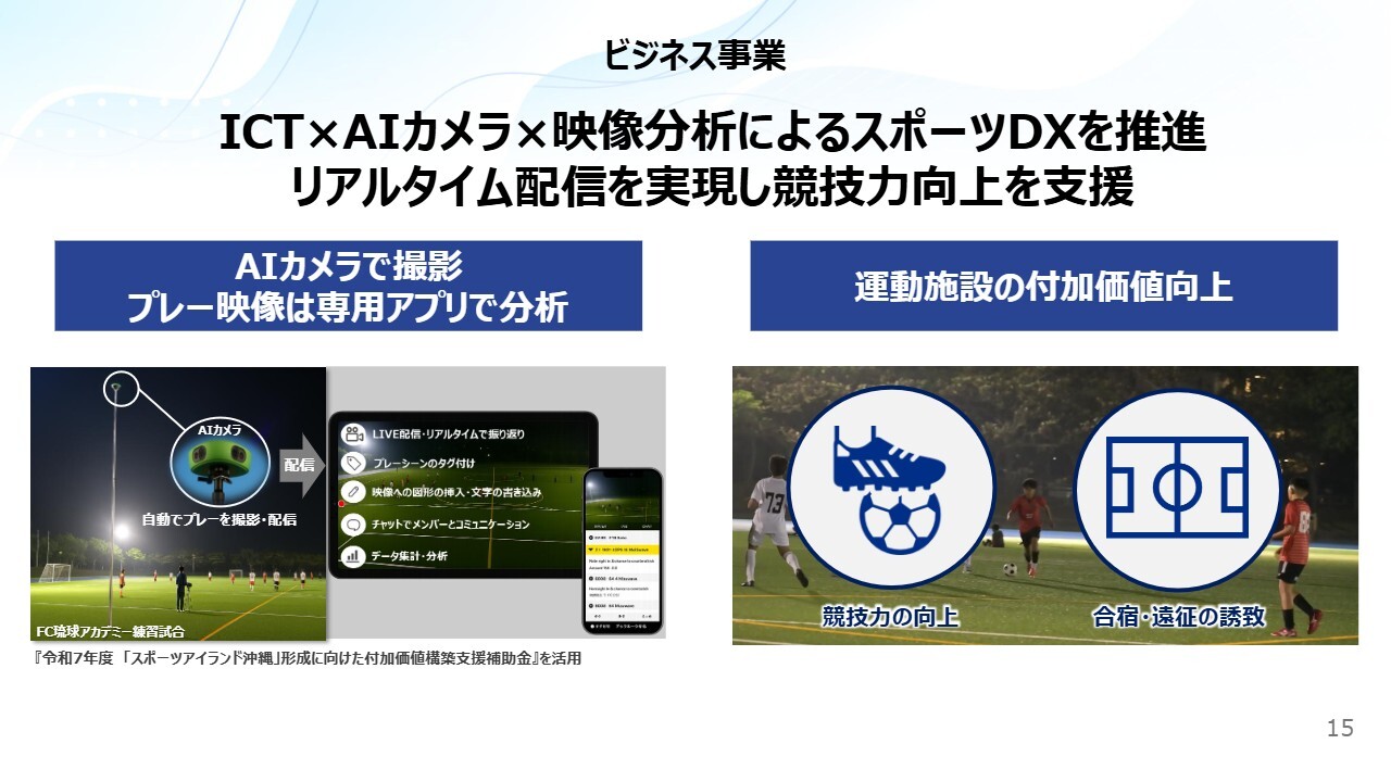 こちらのスライドは、AIカメラを活用したスポーツDXの例です。映像分析の組み合わせにより、選手のスキルアップはもちろんのこと、運動施設に固定設置されることで、この施設自体の付加価値向上につながります。そのため、プロだけでなくアマチュアの方も含め、運動施設への合宿や遠征の誘致につながると考えています。