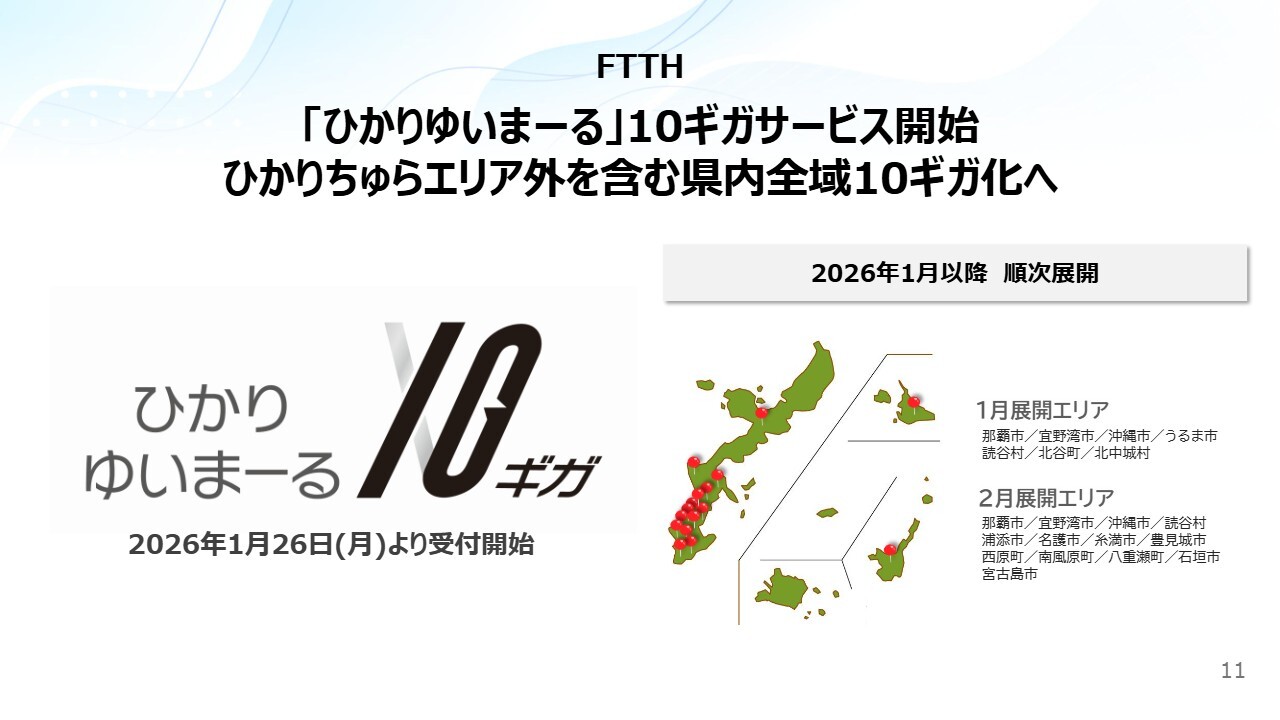 加えて、「ひかりゆいまーる」についても、1月26日より10ギガサービスの受付を開始しました。こちらはNTTコラボモデルとなっており、すでに提供している自前サービス「ひかりちゅら」の10ギガエリアをうまく補完できるというメリットがあります。これにより、県内全域での10ギガ化が可能となります。