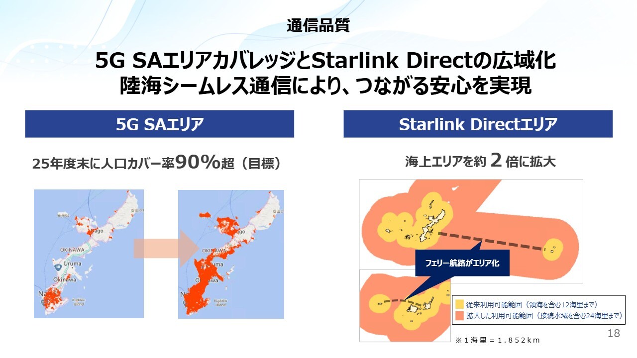 また、スライド右側の地図は「Starlink Direct」のエリアを示しています。このサービスは沖縄でも大変ご好評をいただいており、サービスエリアが2倍に拡大しました。これまでは県内の離島へのフェリーで接続が途切れる箇所があったものの、「Starlink Direct」によって電波が安定して届くようになります。