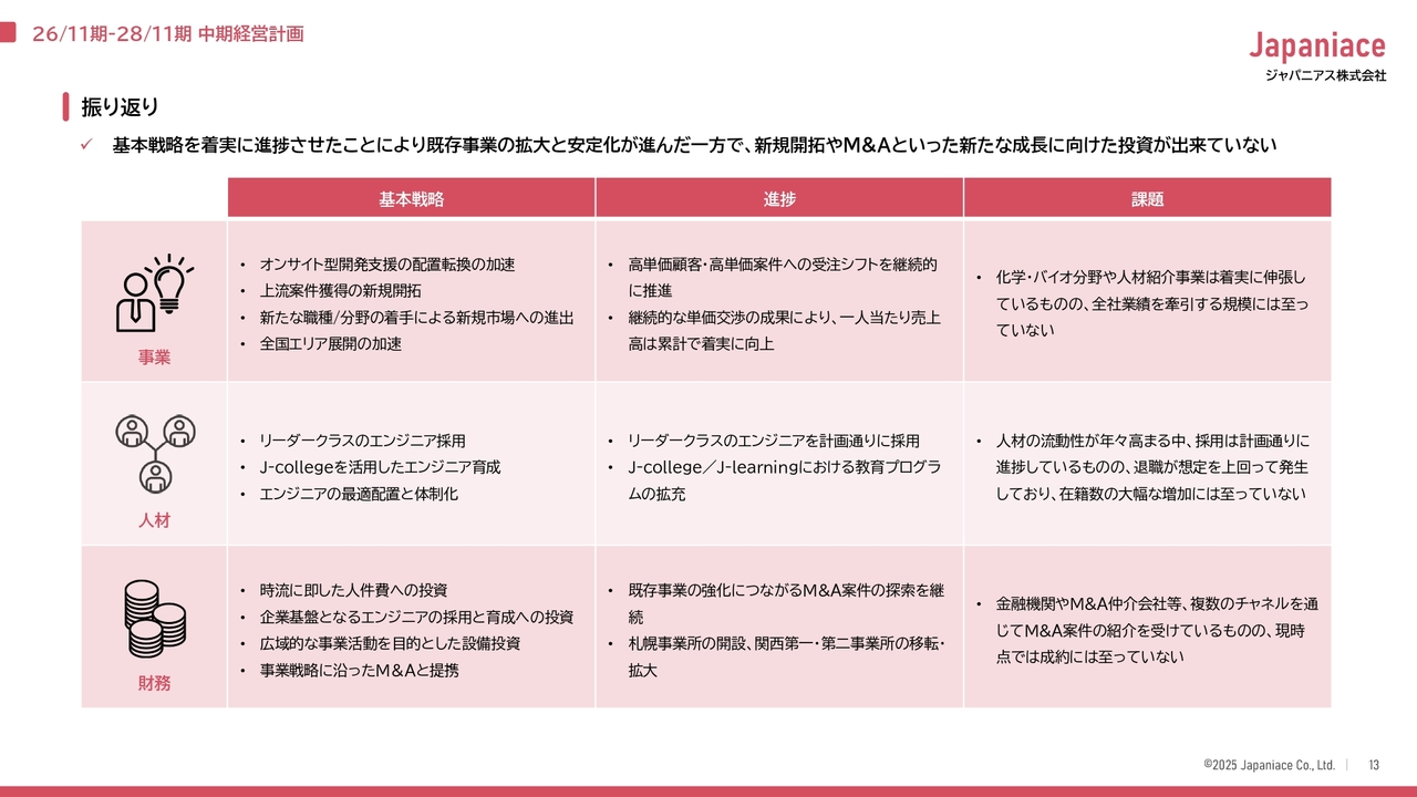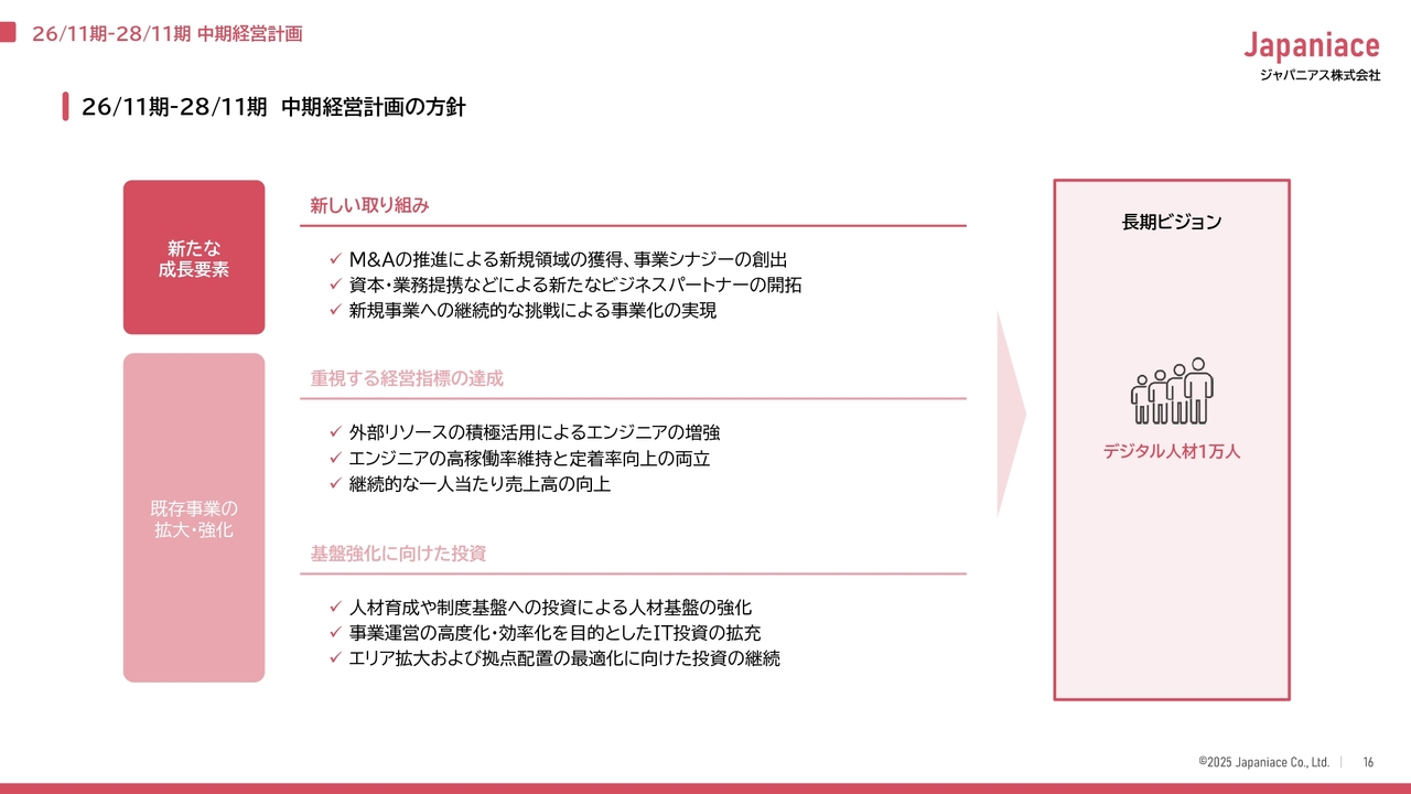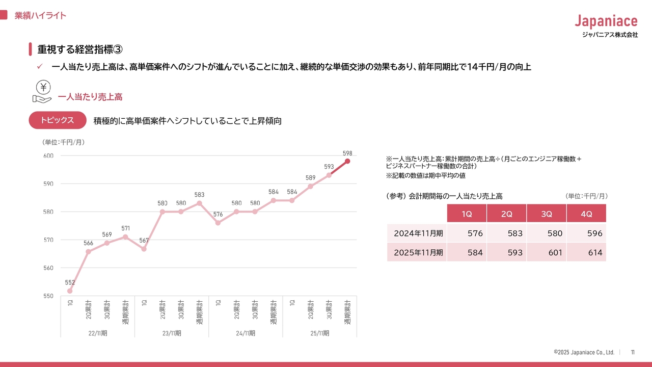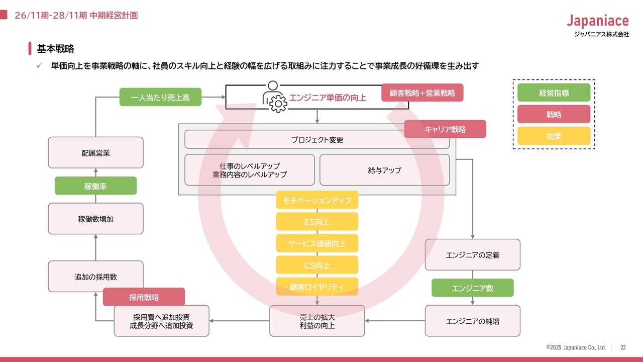 2025年11月期は、事業・人材・財務の3つの基本戦略を立案し、推進しました。事業戦略では、オンサイト型開発支援における高単価案件への受注シフトや継続的な単価交渉により、単価アップが計画以上に進展しました。