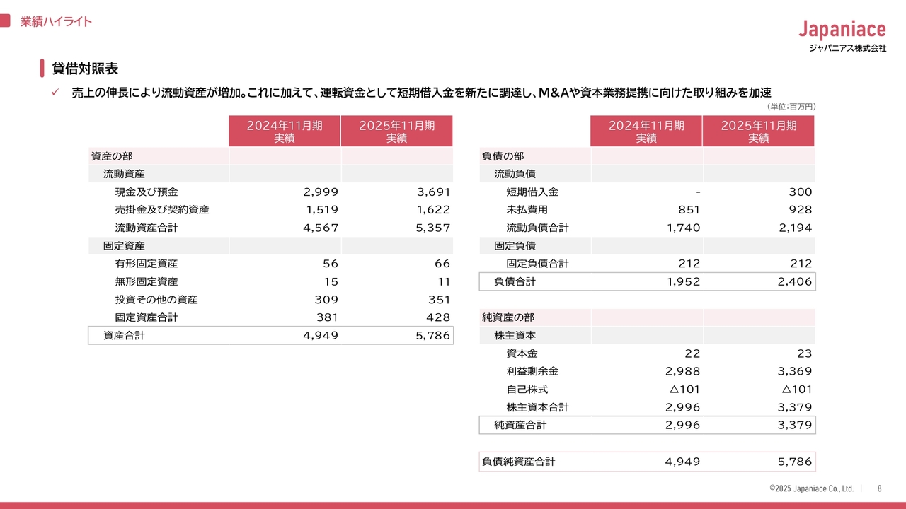 純資産は、当期純利益7億6,500万円を計上したこと、および剰余金の配当として3億8,200万円を支出したことにより増加しました。増加した資産を活用し、M&Aや資本業務提携などの成長投資を一層加速させていきます。