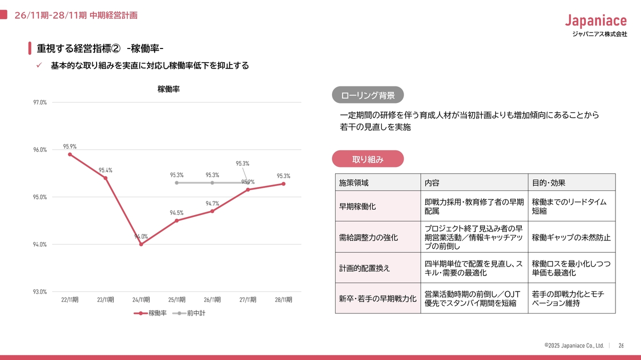 稼働率は現在の高稼働率を維持しつつ、エンジニアの定着率を向上させることを目指します。そのための基盤強化に向け、人材、IT、設備への投資を進めていきます。