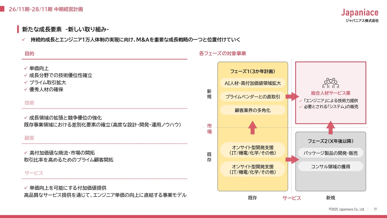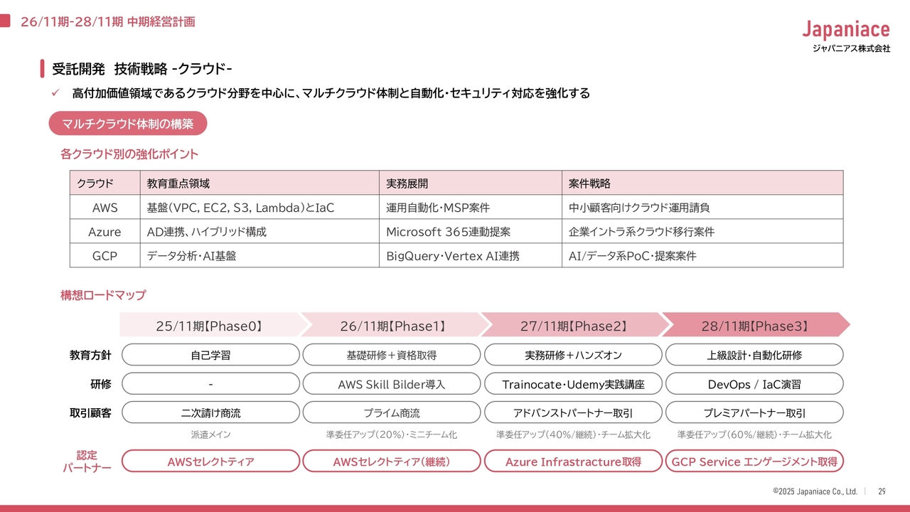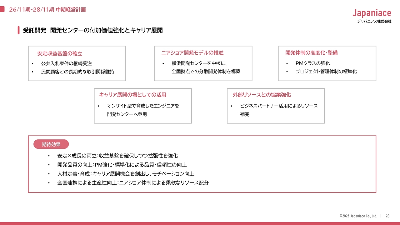 これらの取り組みにより、受託開発を安定した収益基盤として確立するとともに、エンジニアのキャリア開発を通じた定着支援を図ります。