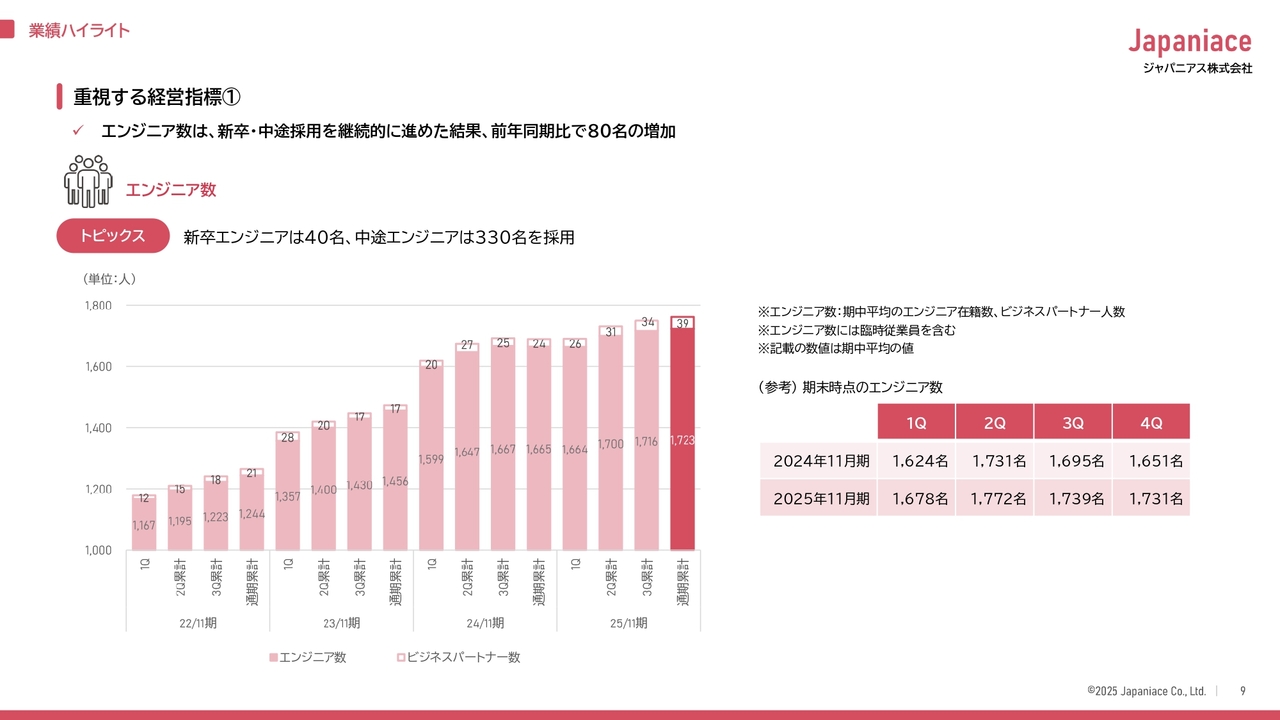 はじめに、業績ハイライトについてご説明します。2025年11月期は、従来と同様に中途採用を中心としたエンジニア採用を進め、エンジニア数を増加させてきました。