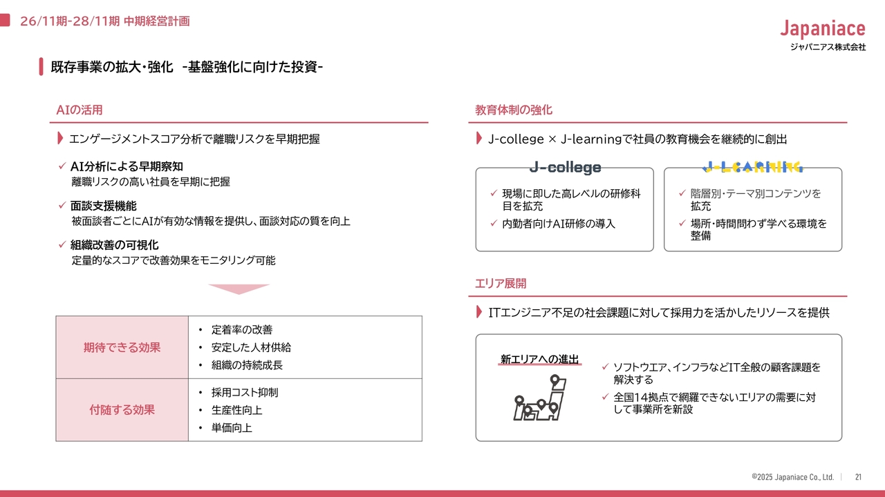 また、既存事業の拡大・強化に必要な投資として「AIの活用」「教育体制の強化」「エリア展開」を実施します。