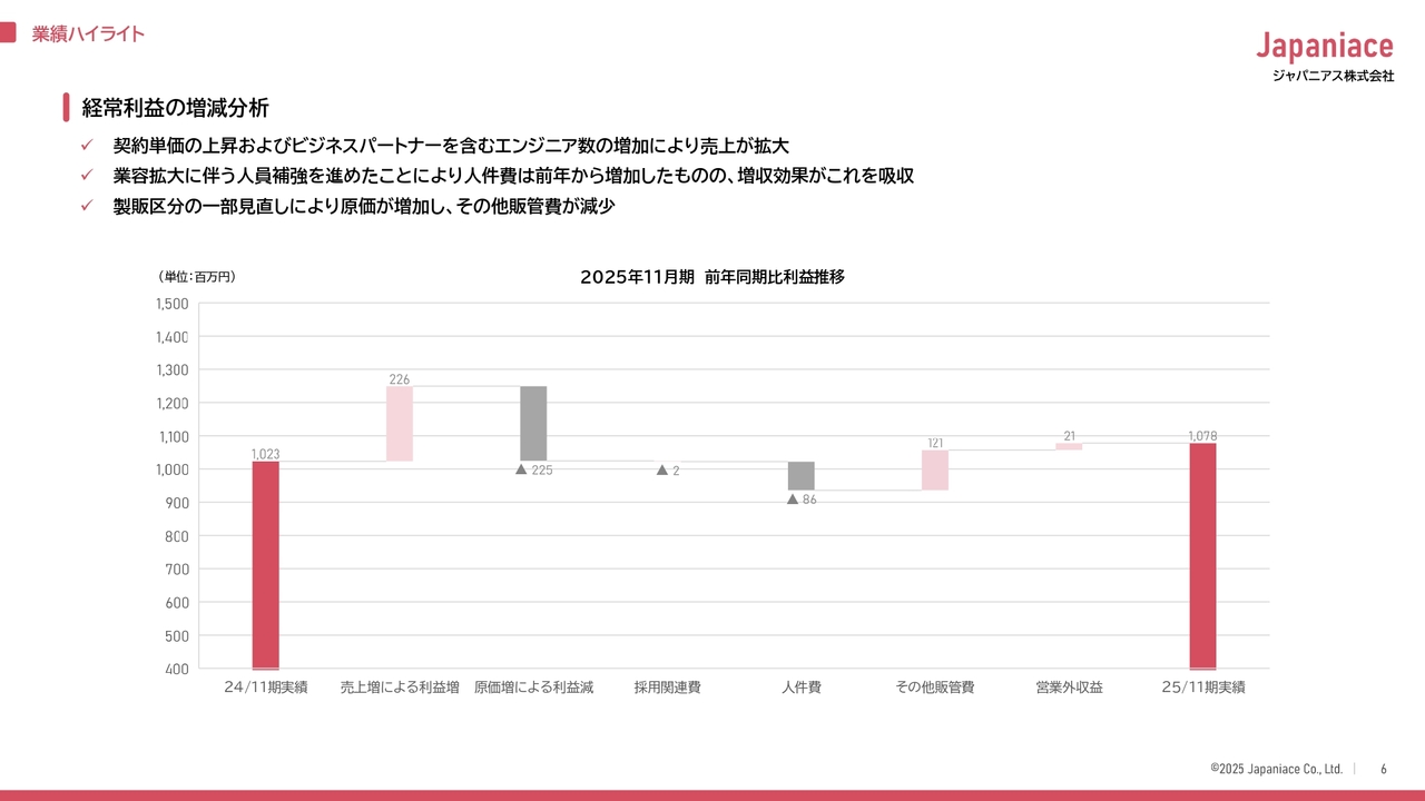 経常利益が前年同期比で増益となった要因は、契約単価の上昇およびビジネスパートナーを含むエンジニア数の増加により売上が拡大した結果、利益が増加したことによるものです。