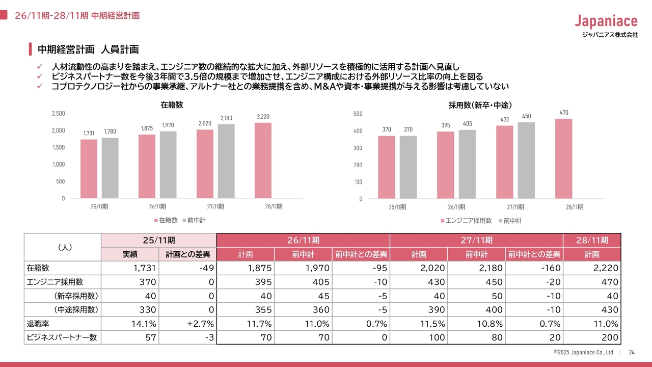 人員計画については、これまでと同様に業績に連動したかたちでエンジニア数を増加させる方針です。ただし、こちらもM&Aや資本・事業提携が与える影響は考慮していません。