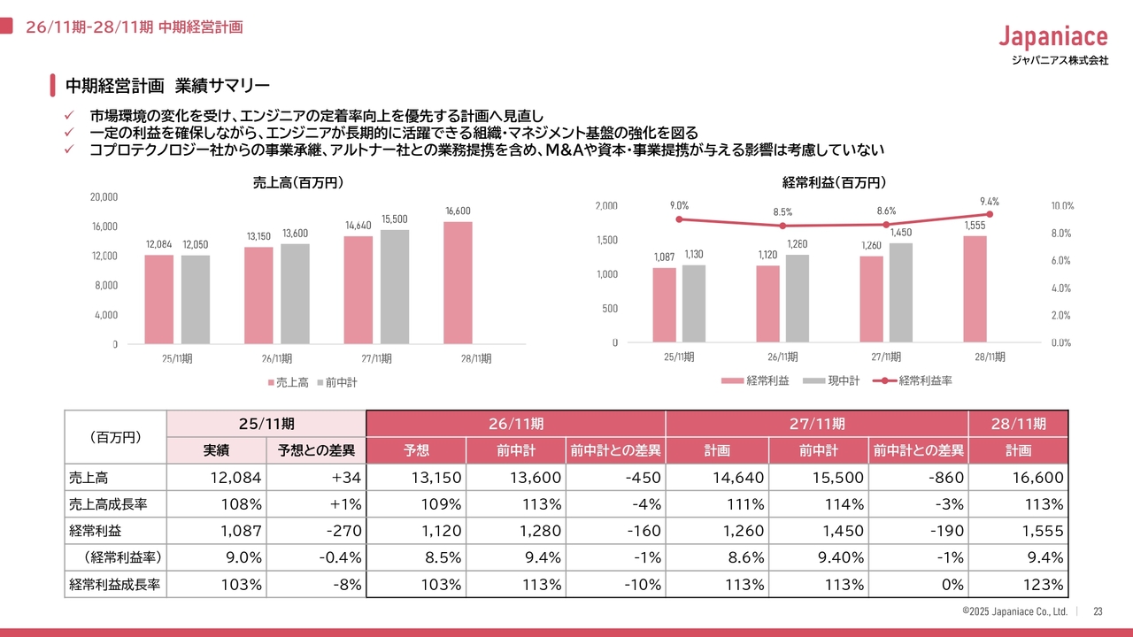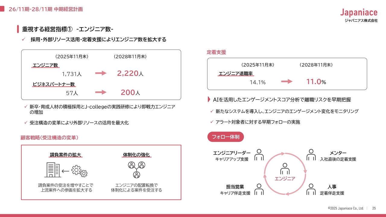 業績数値は、昨今の市場環境の変化を受け、社員の定着率向上を優先するために計画を見直しました。一定の利益を確保しながら、エンジニアが長期的に活躍できる組織・マネジメント基盤の強化を図ります。