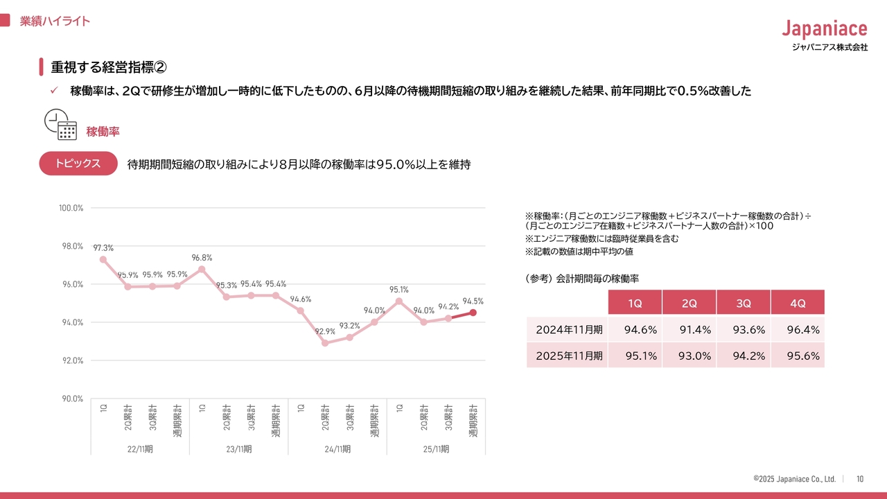 第2四半期の稼働率は研修対象者の増加により一時的に低下しましたが、6月からは待機期間を短縮する取り組みを継続しました。