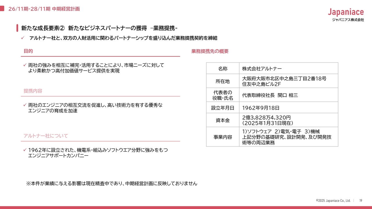 今後も、同じ考えを持つ企業との事業提携を推進していきます。なお、本件が業績に与える影響も現在精査中であり、中期経営計画には反映していません。