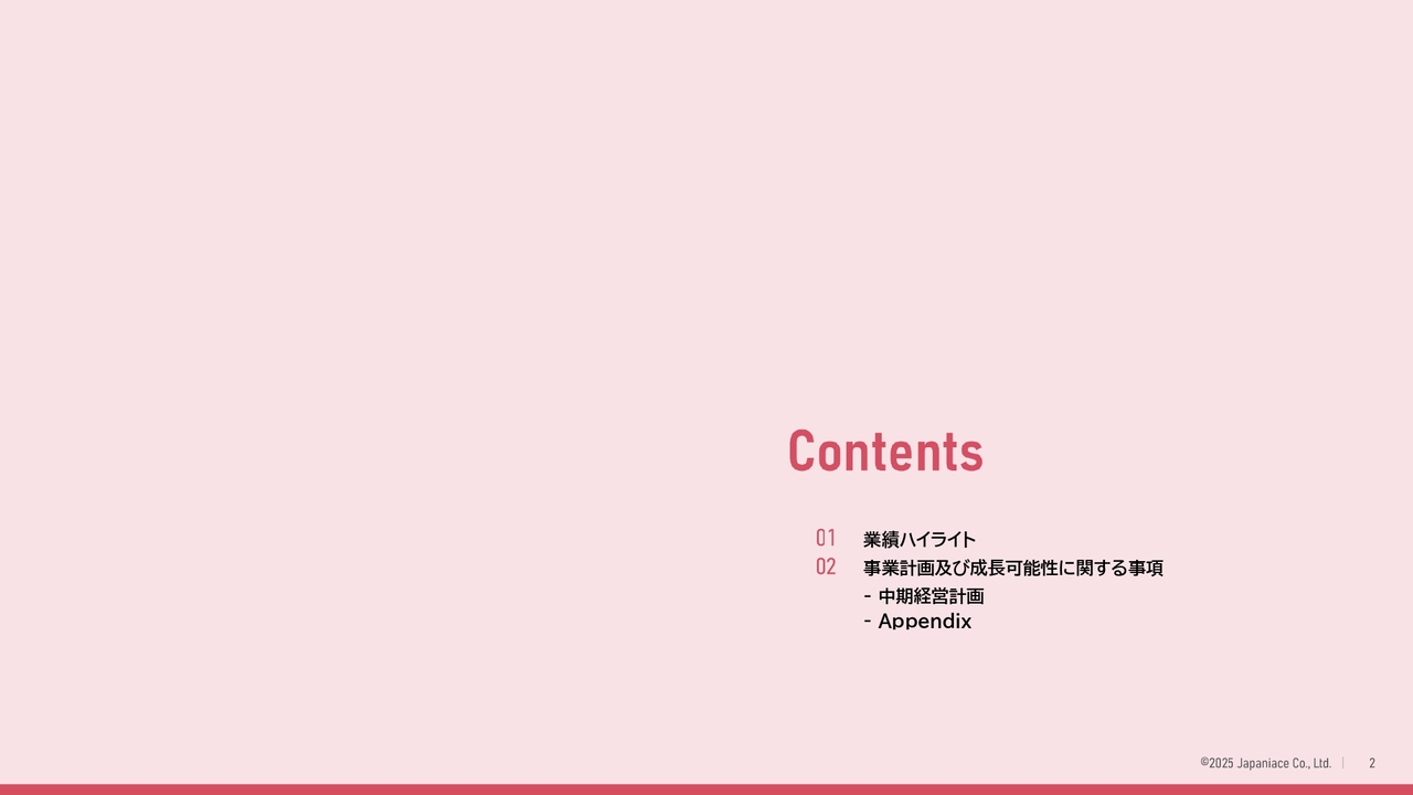 西川三郎氏:みなさま、こんにちは。本日はジャパニアス株式会社2025年11月期決算説明会にご参加いただき、誠にありがとうございます。代表取締役会長兼社長の西川です。それでは、決算説明会資料を用いてご説明します。よろしくお願いします。