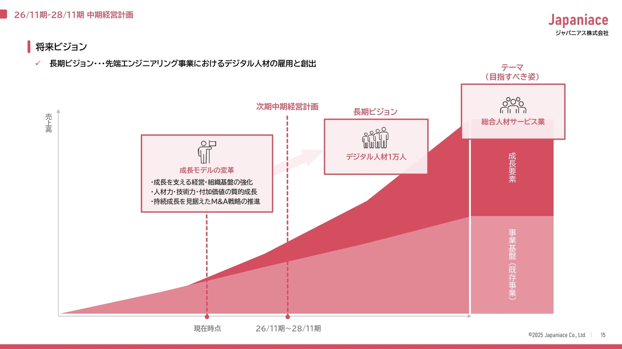 将来ビジョンです。長期ビジョンは変わらず、先端エンジニアリング事業におけるデジタル人材の雇用と創出を通じて「デジタル人材1万人」を目指していきます。