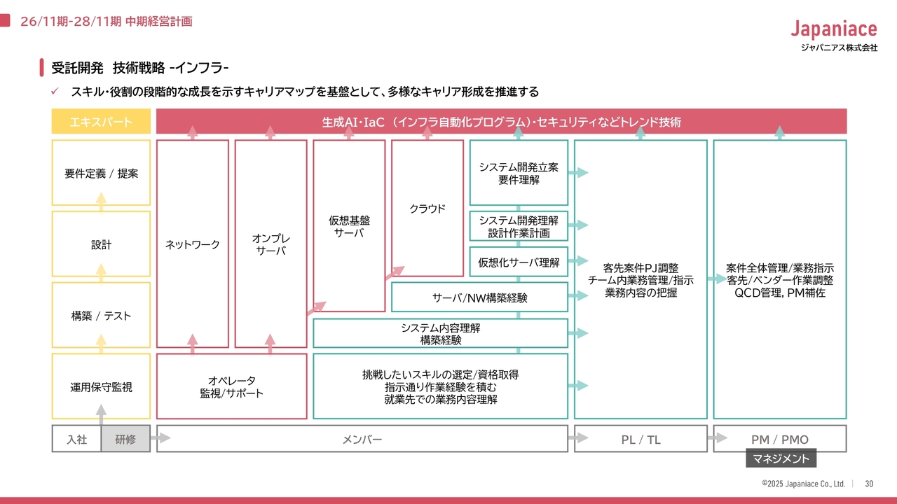 インフラ分野では、スキルや役割の段階的な成長を示すキャリアマップを基盤として、多様なキャリア形成を推進していきます。