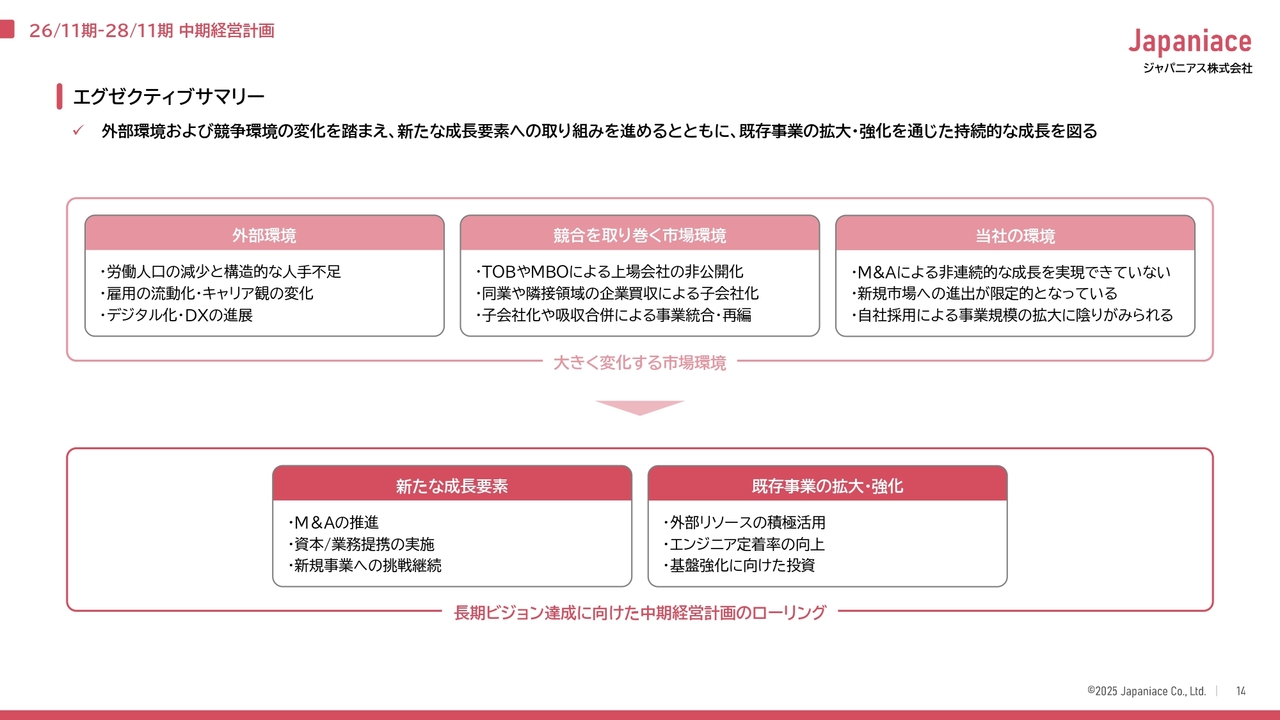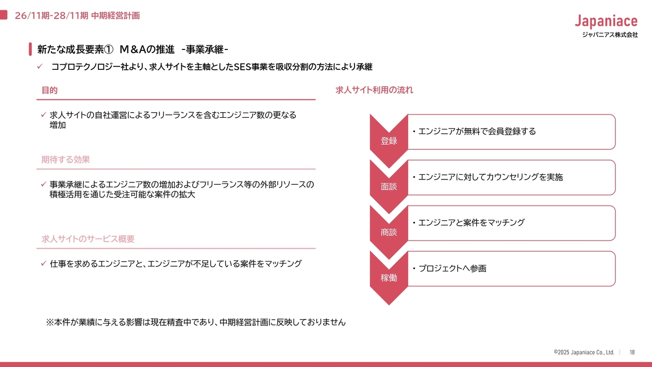 なお、本件が業績に与える影響は現在精査中であり、中期経営計画には反映していません。しかしながら、別途公表していますとおり、譲り受けるSES事業の2025年3月期の売上高は14億円でしたので、今後の業績向上に大きく寄与すると考えています。