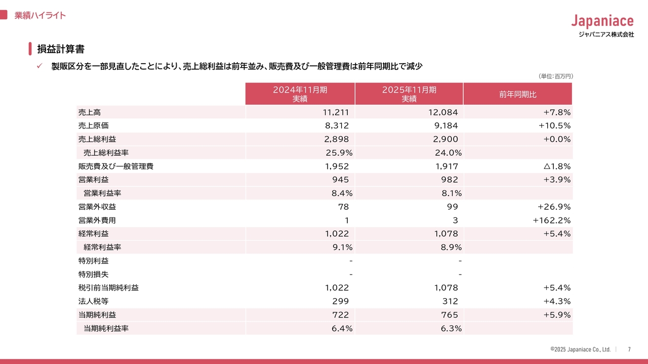売上高の詳細は後ほどご説明しますが、経営指標がいずれも前年を上回る水準で推移した結果、前年同期比7.8パーセントの増加となりました。