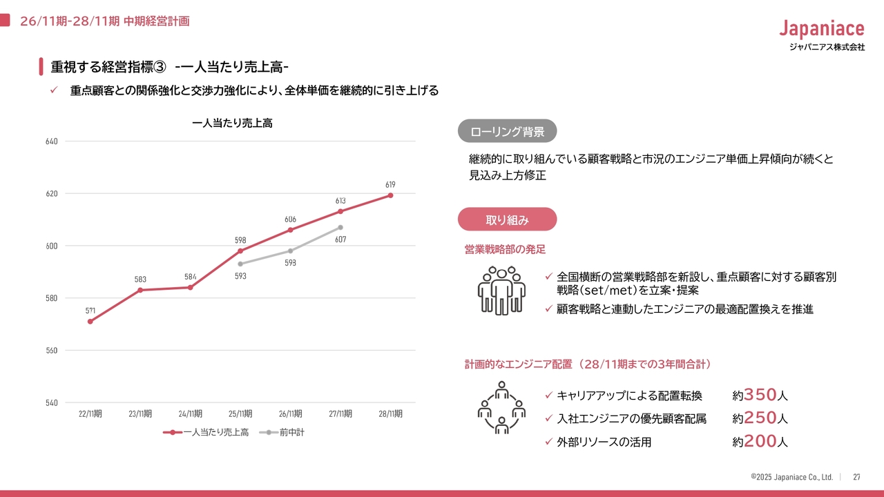 1人当たり売上高は、全国横断の営業戦略部を新たに設置し、全社支店を通じた営業活動により、契約単価の上昇を目指します。