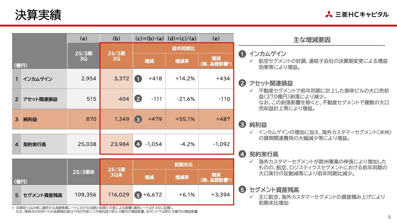 第3四半期の決算実績については、不動産セグメントや航空セグメントが好調に推移したこと、さらに海外カスタマーセグメントの米州事業で貸倒関連費用が大幅に減少したこと、加えて連結子会社の決算期変更による増益効果もあり、純利益は前年同期比479億円増の1,349億円となりました。