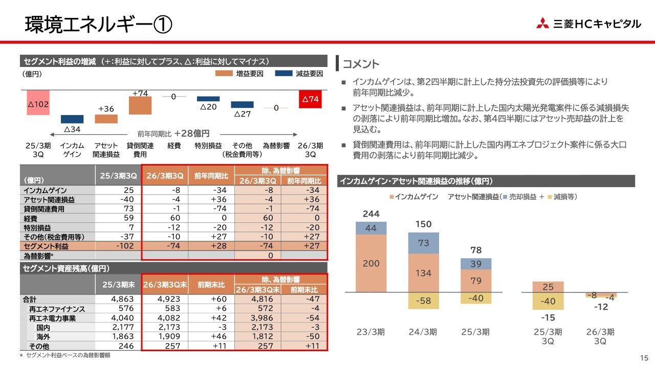 また、環境エネルギーセグメントにおいては、第3四半期までアセット売却益の計上はありませんでしたが、第4四半期にはアセット売却益の計上を見込んでいます。