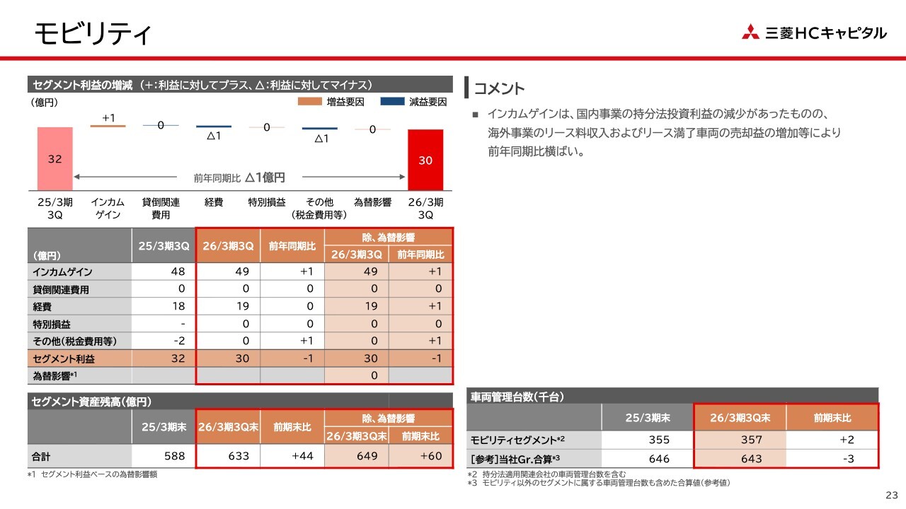 モビリティセグメントについては、国内事業において持分法投資利益が若干減少したものの、海外事業におけるリース料収入やリース満了車両の売却益が増加したことにより、前年同期比でほぼ横ばいとなっています。