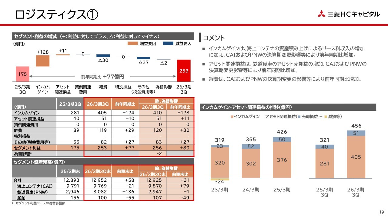 ロジスティクスセグメントについても、子会社の決算期変更による増益効果に加え、海上コンテナの資産積み上げによるリース料収入の増加や鉄道貨車のアセット売却益の増加により、セグメント利益は前年同期比77億円の増益となりました。