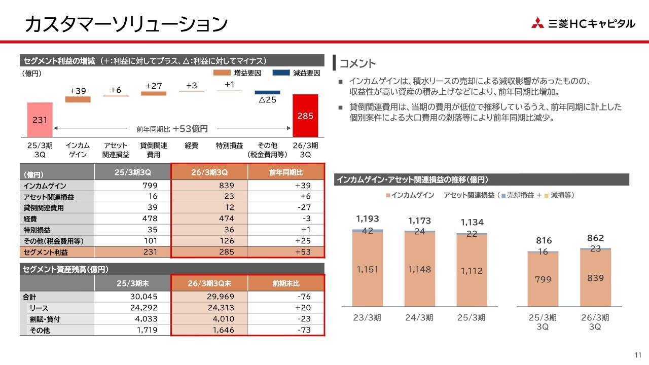 まずカスタマーソリューションについてです。先ほど少しお話ししましたが、収益性の高い資産への入れ替えが着実に進み、インカムゲインを伸ばしたことに加え、貸倒関連費用も低水準で抑えることができました。これにより、セグメント利益は前年同期比で53億円の増益となりました。
