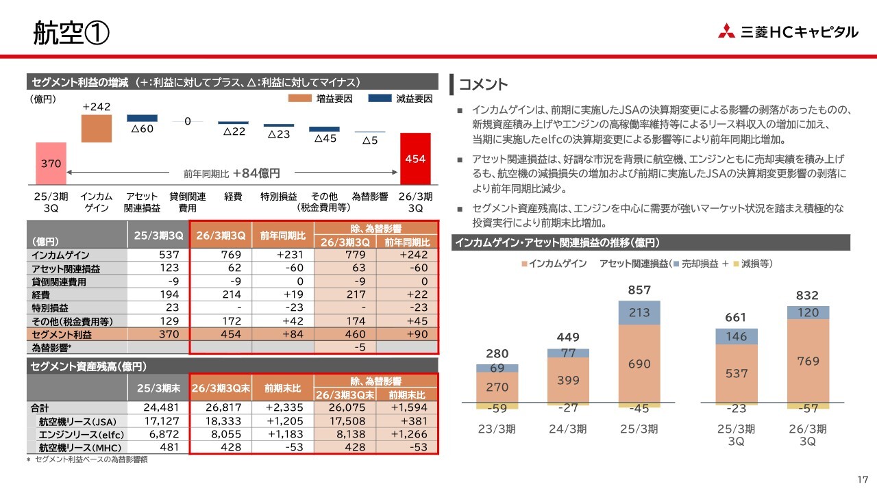 航空セグメントについては、資産の積み上げが着実に進んでおり、これに伴う増益が見られます。また、エンジンリースの稼働率が非常に上がっており、この稼働率の向上による収益の上昇と合わせて、両者が約半々で貢献しています。
