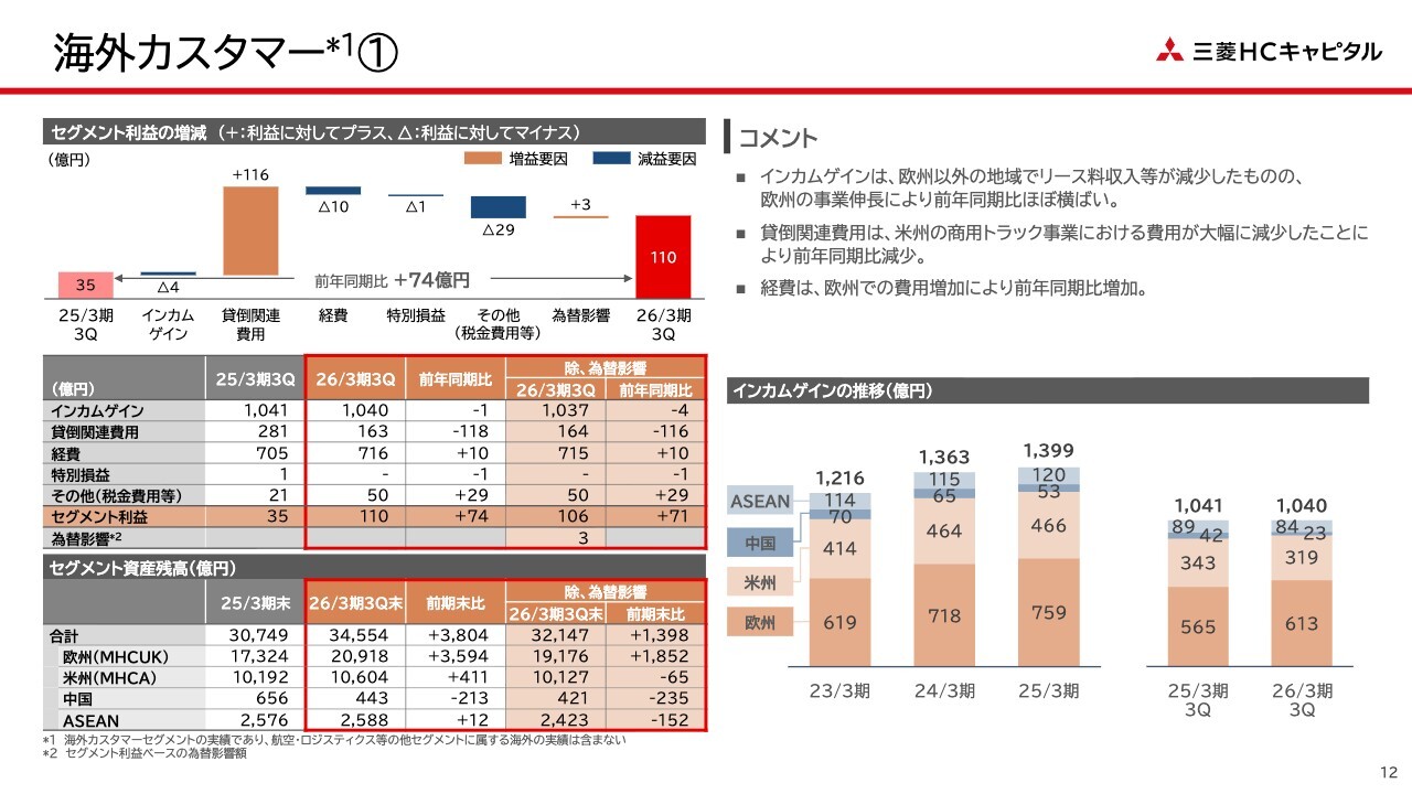 ③の純利益については、冒頭のハイライトでもご説明しましたが、インカムゲインの増加に加え、海外カスタマーセグメントのベース事業における貸倒関連費用の大幅な減少が寄与し、前年同期比で479億円の増益となりました。