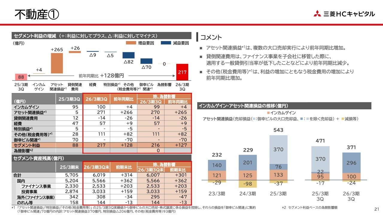 不動産セグメントについてです。スライドをご覧ください。前年同期にあった御幸ビルディングの売却による増益効果の剥落があったものの、大口の複数のアセット売却益などにより、セグメント利益は前年同期比で128億円の増益となりました。