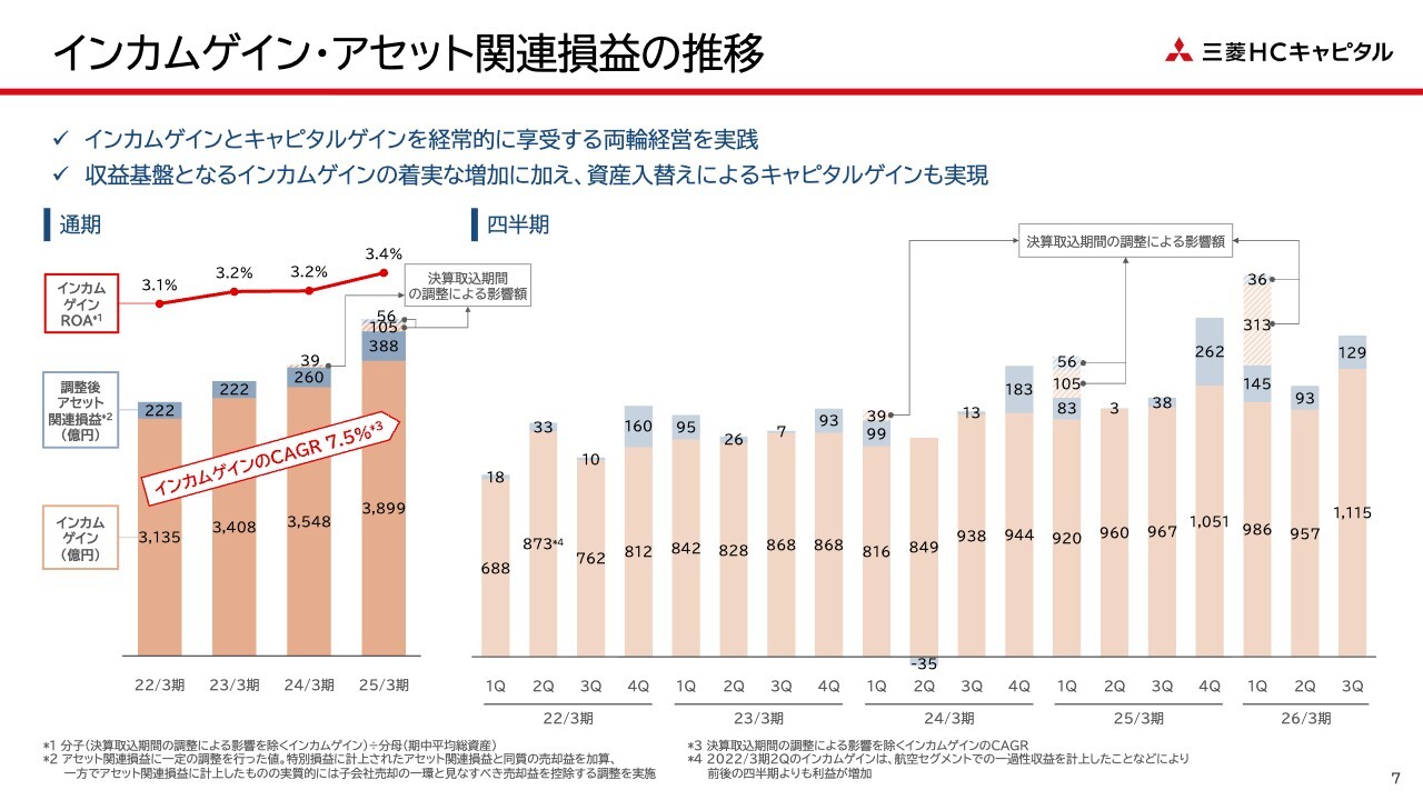 こちらはスライドをご覧のとおり、収益基盤であるインカムゲインについて、四半期ごとには多少の変動があるものの、年間で見ると年率7.5パーセントの成長率で着実に成長していることがわかります。