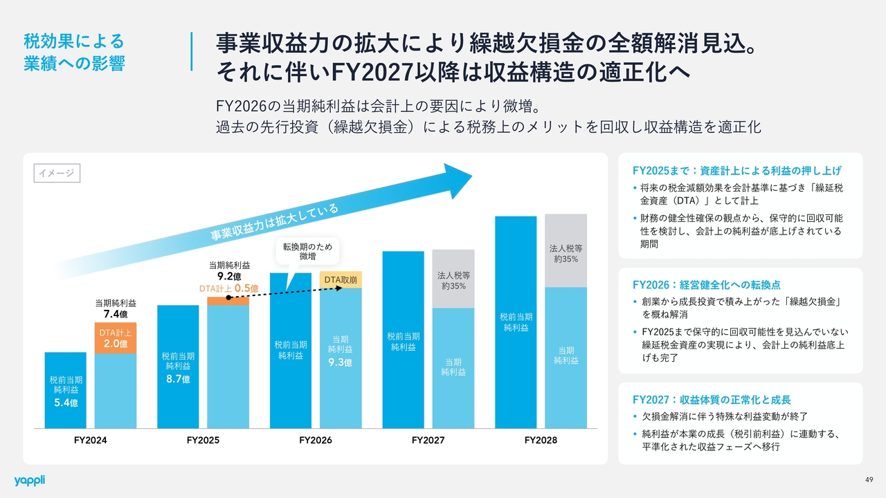 つまり、2026年で節税メリットを使い切り、2027年からは、いよいよ実力値での成長フェーズに入るということです。事業収益力そのものは着実に拡大していますので、ご安心ください。