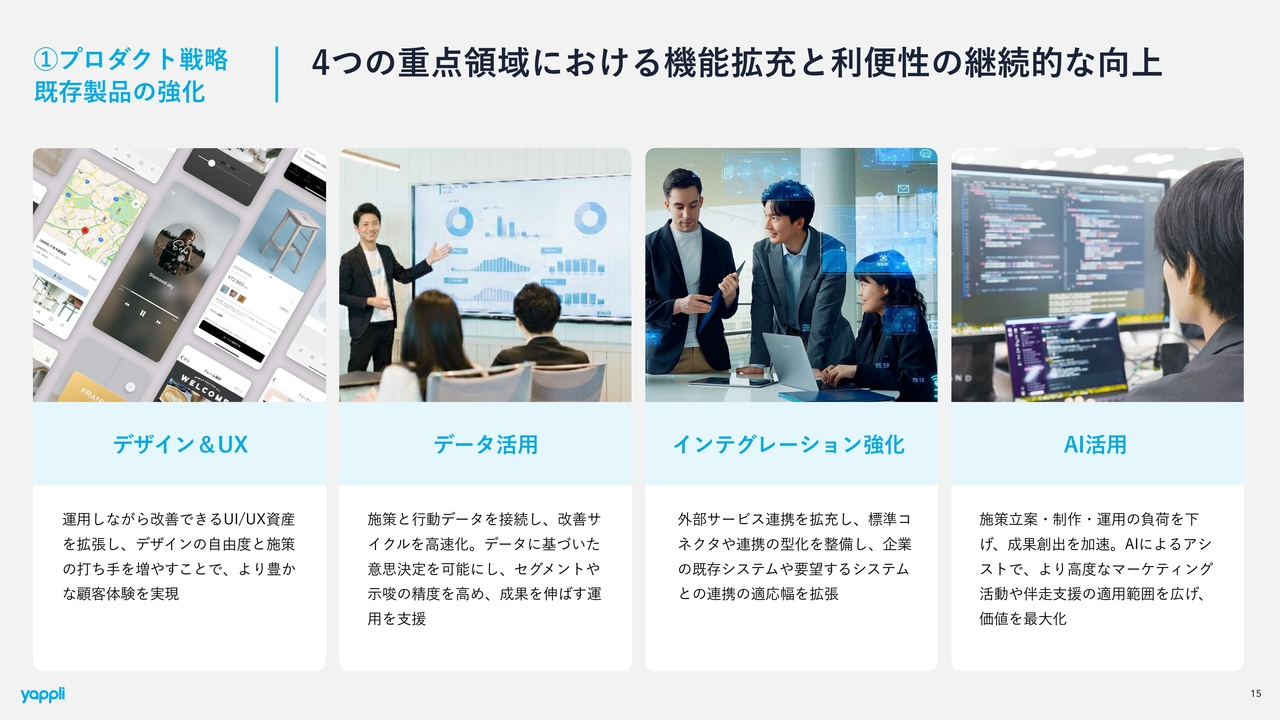 まずはプロダクト戦略からご説明します。アプリ開発プラットフォーム「Yappli」を中心に、既存製品の強化を継続的に行っています。デザインやUX、データ活用、インテグレーション、AI活用といった領域を強化し、既存製品の価値を継続的に高める取り組みを続けていきます。
