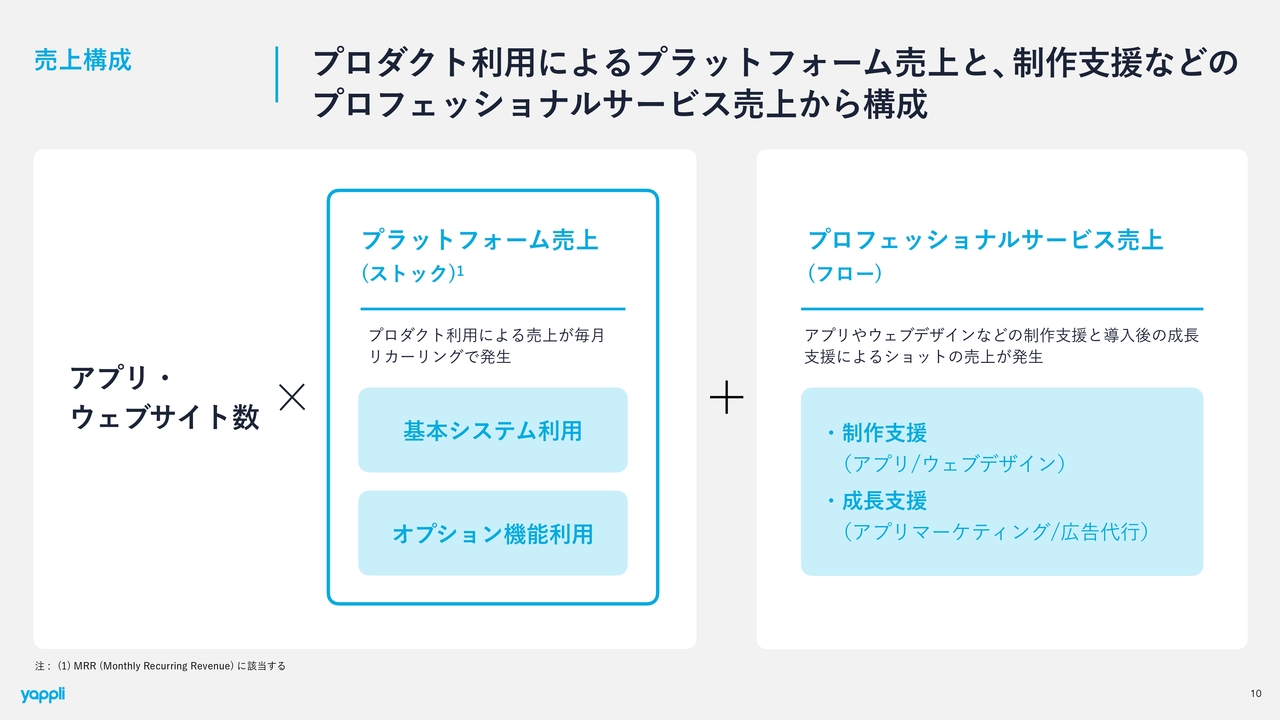 当社の売上構成をご説明します。アプリやWebサイトの数に応じて課金しており、その課金はプラットフォーム売上とプロフェッショナルサービス売上の2つに大別されます。