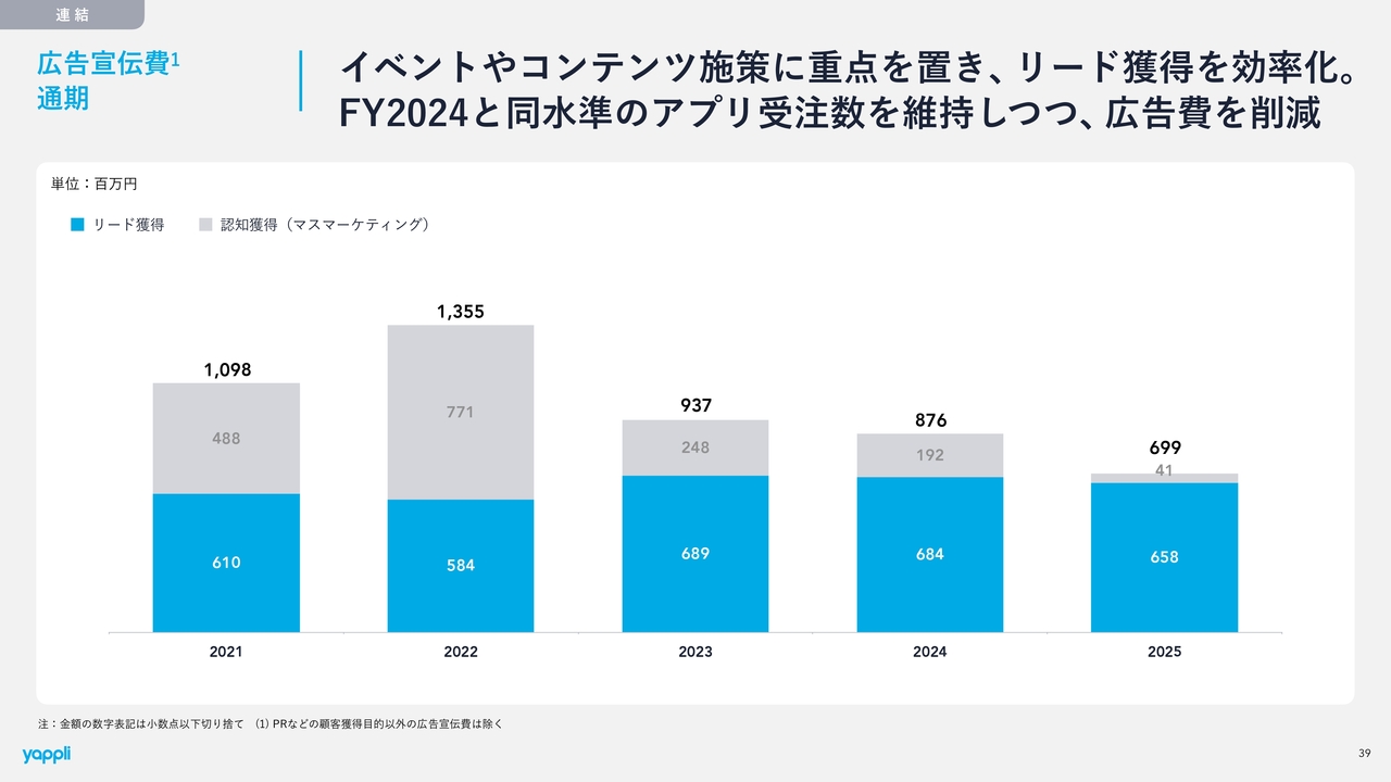 リード獲得費用は昨年とほぼ変わらず6億5,800万円で、継続的な出稿により、より高い受注効率を実現しています。