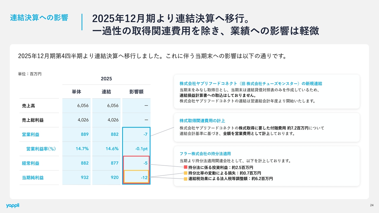詳細はスライドに記載していますが、株式取得に伴うアドバイザー費用など一過性の取得関連費用を除き、当期末の業績への影響は軽微です。スライドに示しているとおり、2025年12月期の連結化による業績への影響は限定的です。
