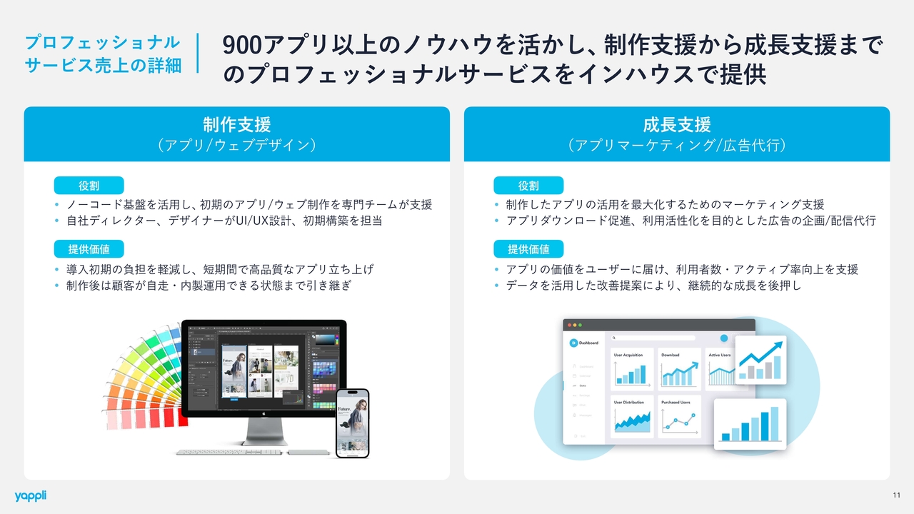 プロフェッショナルサービス売上の詳細についてご説明します。先ほどの説明のとおり、制作支援・成長支援のそれぞれにおいて、ヤプリ従業員がオンボード支援、アプリ制作、Web制作、モバイルオーダーの構築を提供することで付加価値を提供しています。