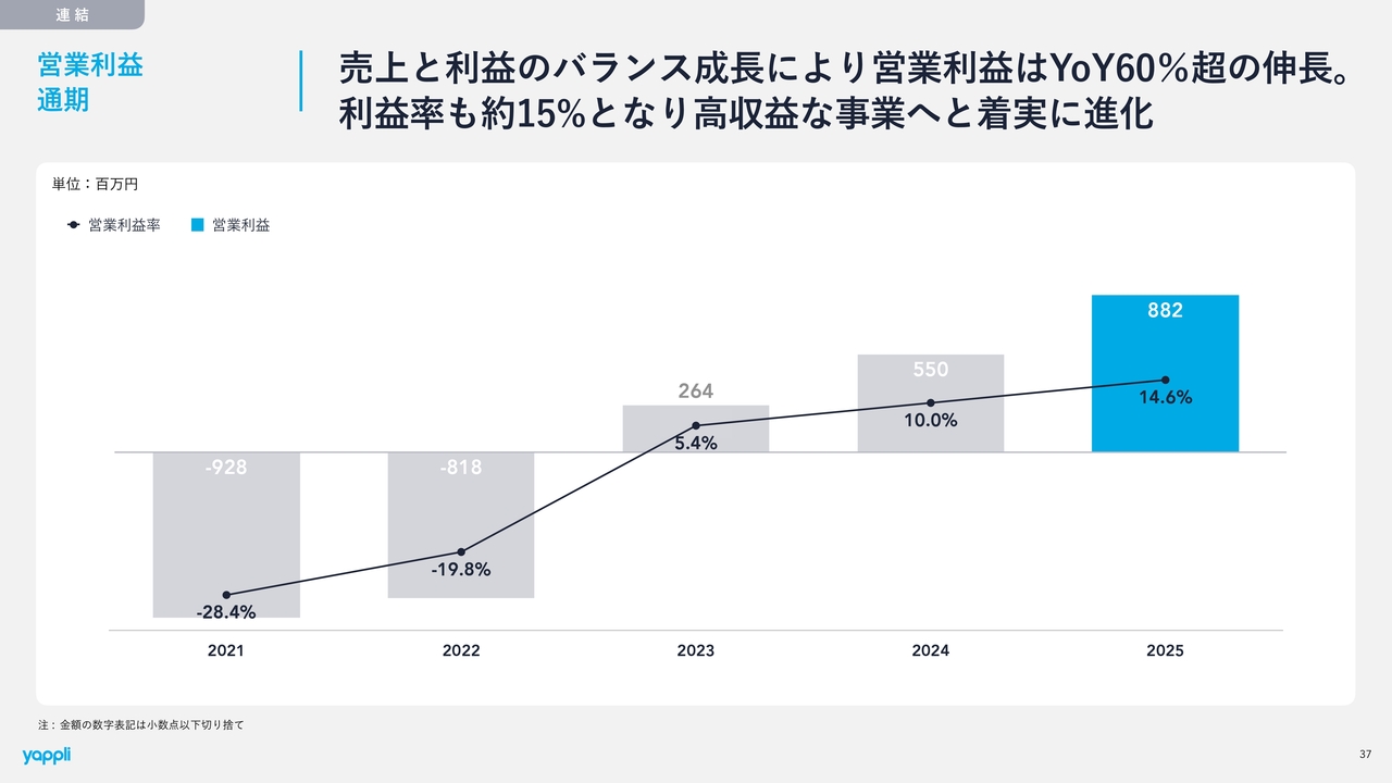 営業利益です。売上と利益のバランス成長により、営業利益は前年同期比でプラス60パーセントという大きな伸びを記録しました。営業利益率も約15パーセントとなり、非常に高収益な事業へと着実に進化しています。