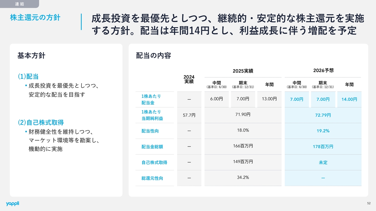 具体的には、2026年の予想として、中間配当と期末配当のそれぞれを7円、配当性向は19.2パーセントを見込んでいます。また、昨年は自社株式の取得も行い、総還元性向は34パーセントとなりました。