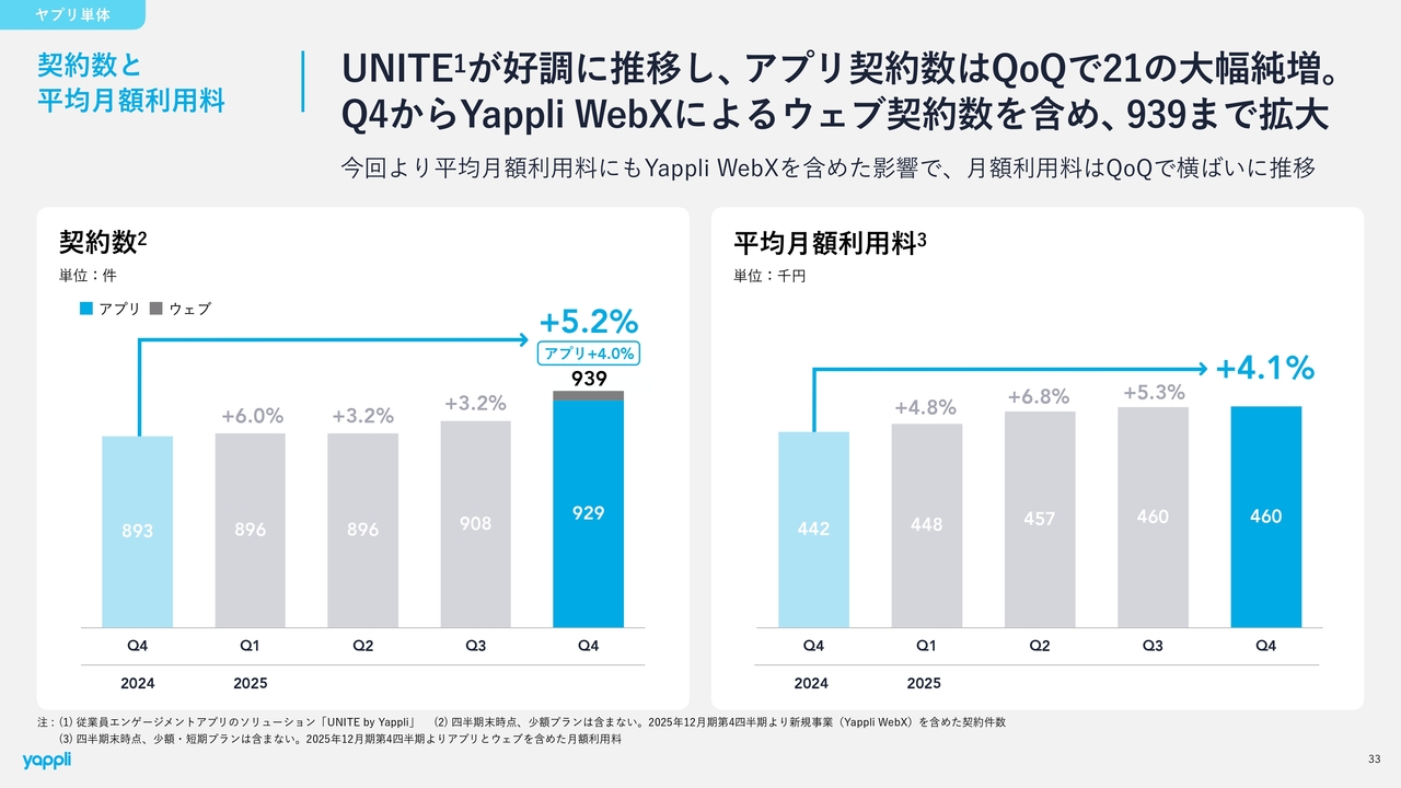 構成比率では、「UNITE」が着実に伸びてきており、今後は「UNITE」や新規事業「Yappli WebX」などの契約数の増加を期待しています。