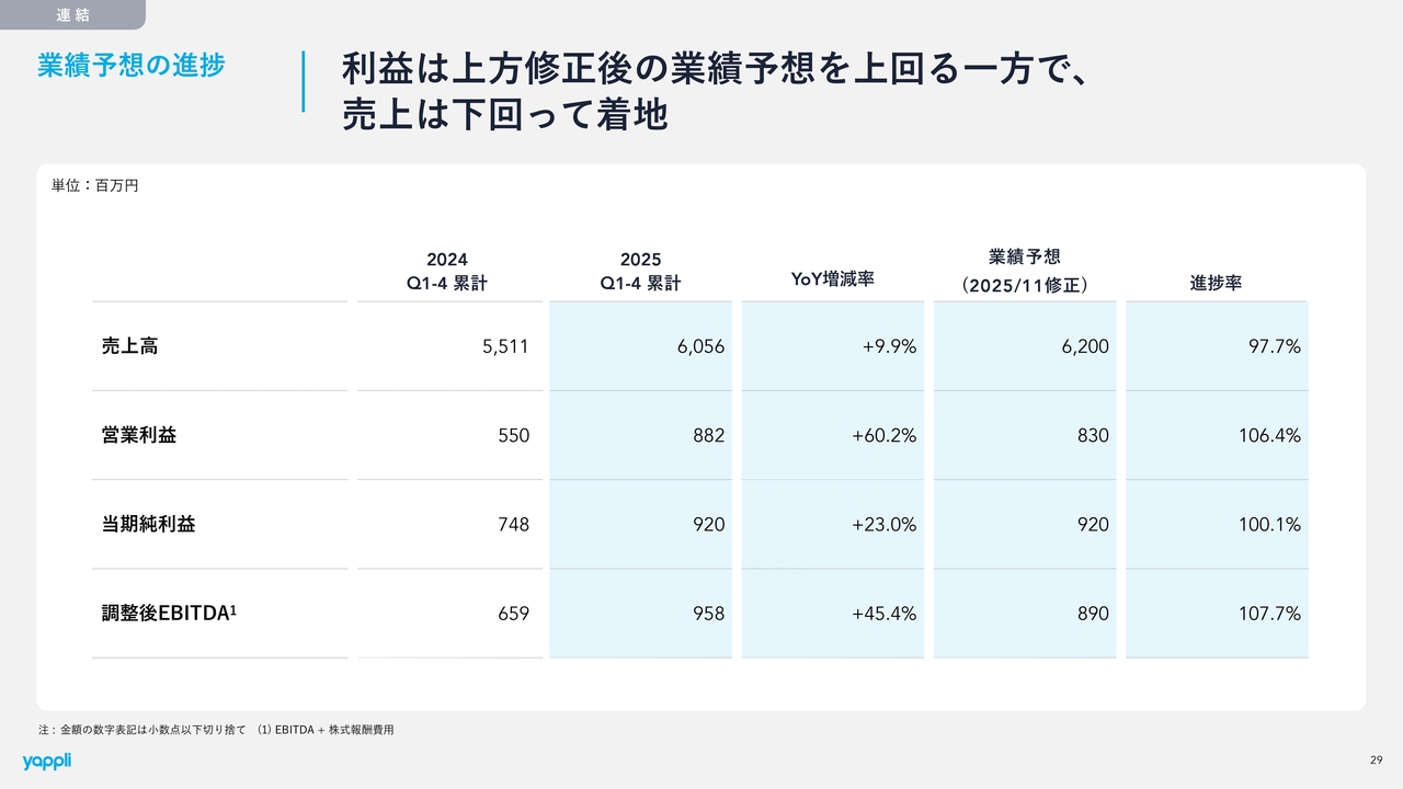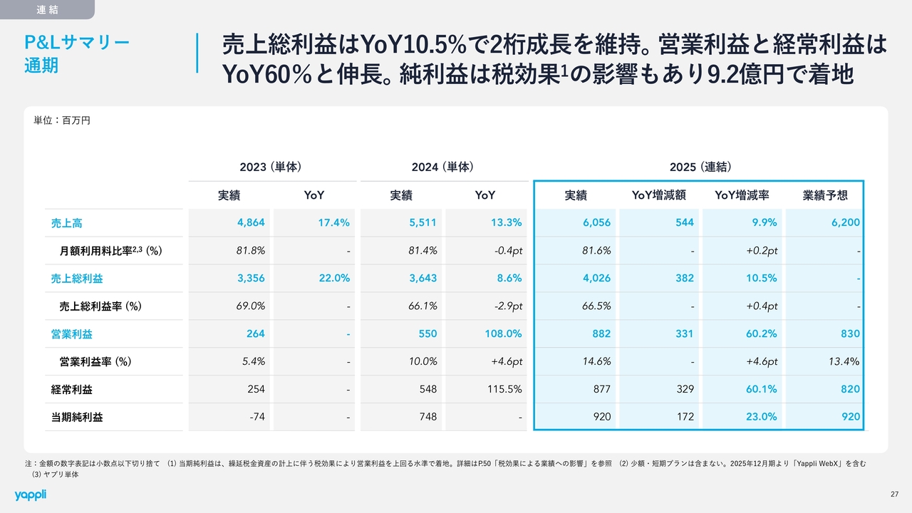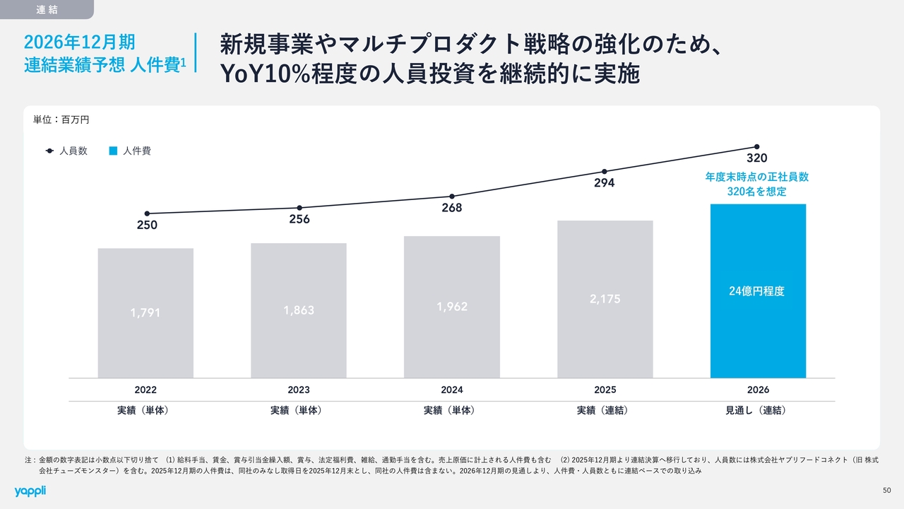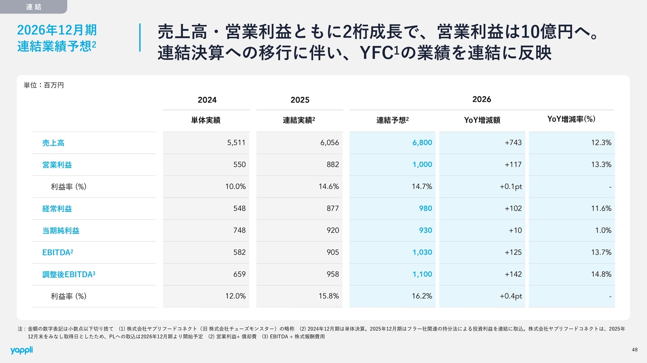 2025年12月期第4四半期より連結決算へ移行し、2026年12月期からはヤプリの子会社であるヤプリフードコネクト社の業績が取り込み開始となります。そのため、トップラインが若干増加する予定です。