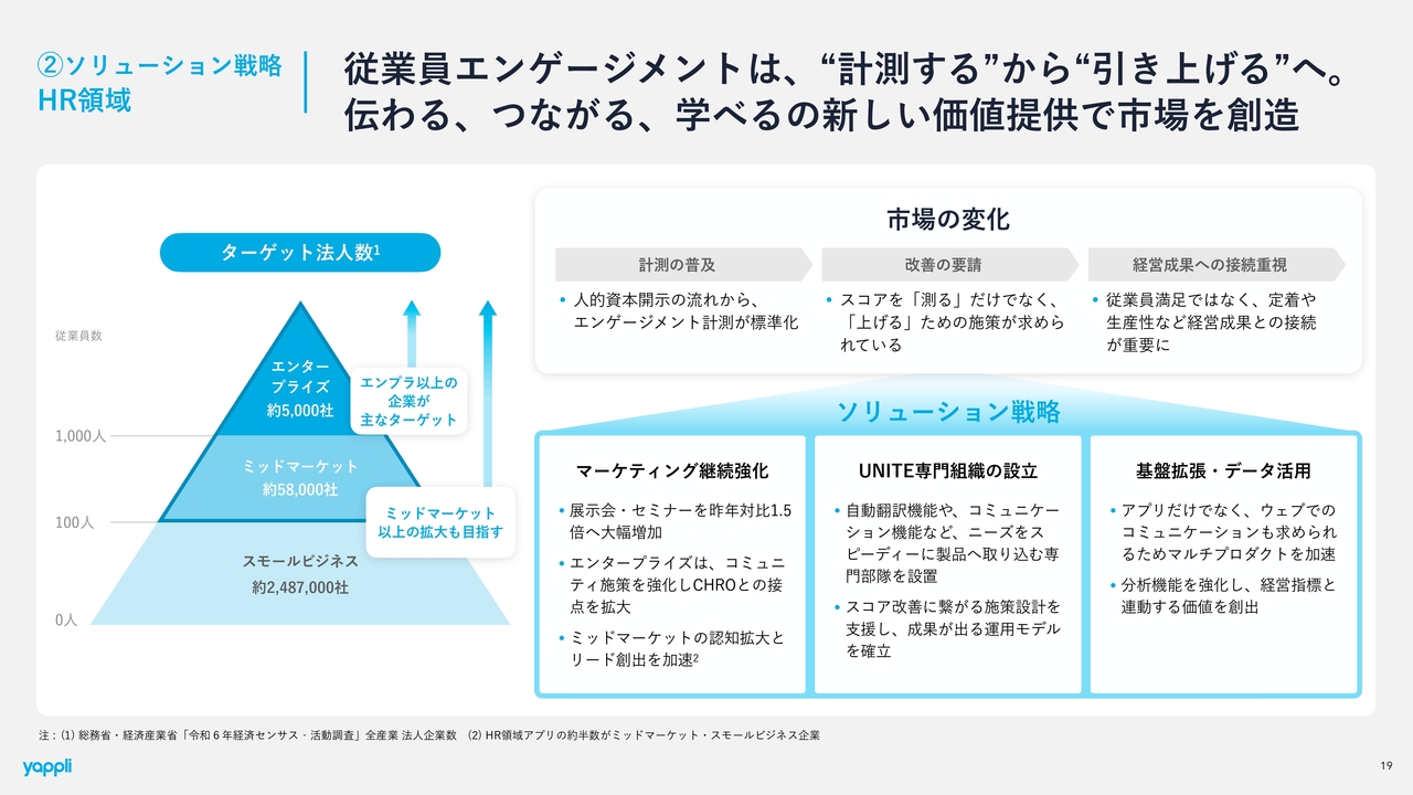 HR領域では「UNITE by yappli」(以下、単に「UNITE」と表記)というソリューションを提供していますが、市場はまだ黎明期と捉えています。現在、当社内でも「UNITE」の契約数が著しく伸びており、さらに成長させるためスライドに記載されているような戦略を進めていきます。