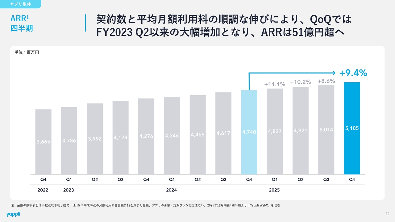 ARRの四半期推移ですが、成長率は前年同期比プラス9.4パーセントの51億8,500万円となっています。前四半期よりも成長率が高まり、ARRが51億円を超えました。