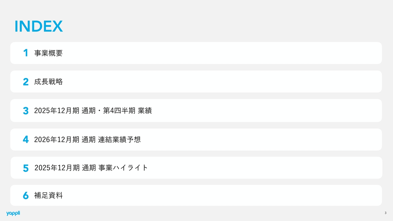 本日は、事業概要から、2025年12月期の通期および第4四半期の業績、2026年12月期の連結業績予想、事業ハイライトについてご説明します。また、事業概要および成長戦略を一部アップデートしましたので、ポイントを簡単にご説明します。