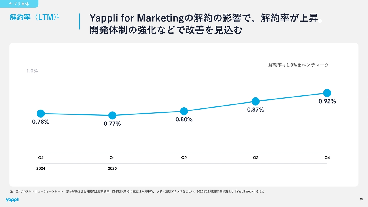 解約率は若干上昇しており、直近12ヶ月のLTMは0.92パーセントとなっています。特に店舗向けアプリ「Yappli for Marketing」の解約が増加したことで、解約率が上昇しています。
