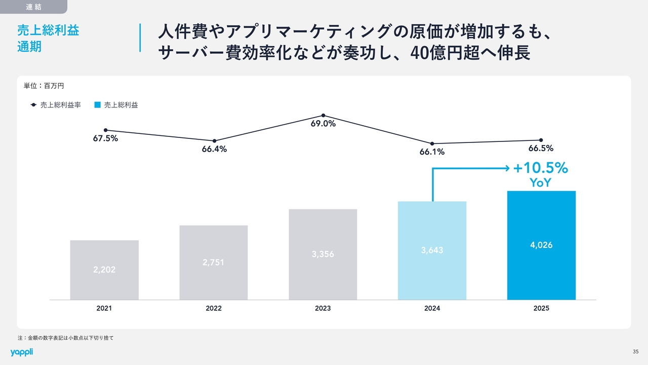 第4四半期は年度末ということもあり、賞与支給などで原価の増加がありましたが、サーバー費用の効率化などにより、引き続き高い売上総利益率を維持しました。昨年と比較しても、原価率が大幅に改善された四半期となっています。
