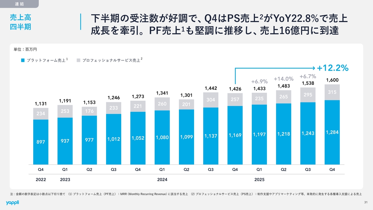 四半期別の売上高推移です。第4四半期は前年同期比12.2パーセント増の16億円となりました。この成長を牽引したのはプロフェッショナルサービス売上で、前年同期比22.8パーセントの伸びを記録しました。
