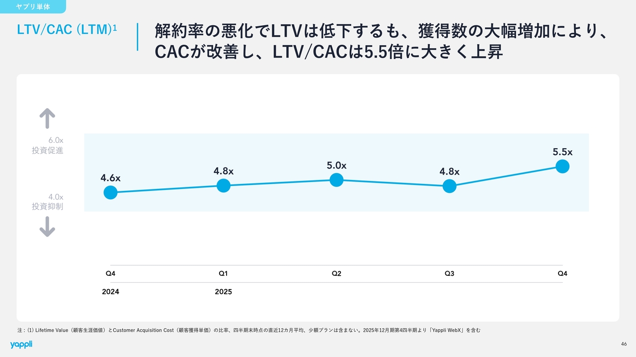 LTV/CAC(LTM)です。解約率の悪化によりLTVは低下しましたが、第4四半期の獲得数増加に伴い、CACが改善し、LTV/CAC(LTM)は5.5倍に大きく上昇しました。