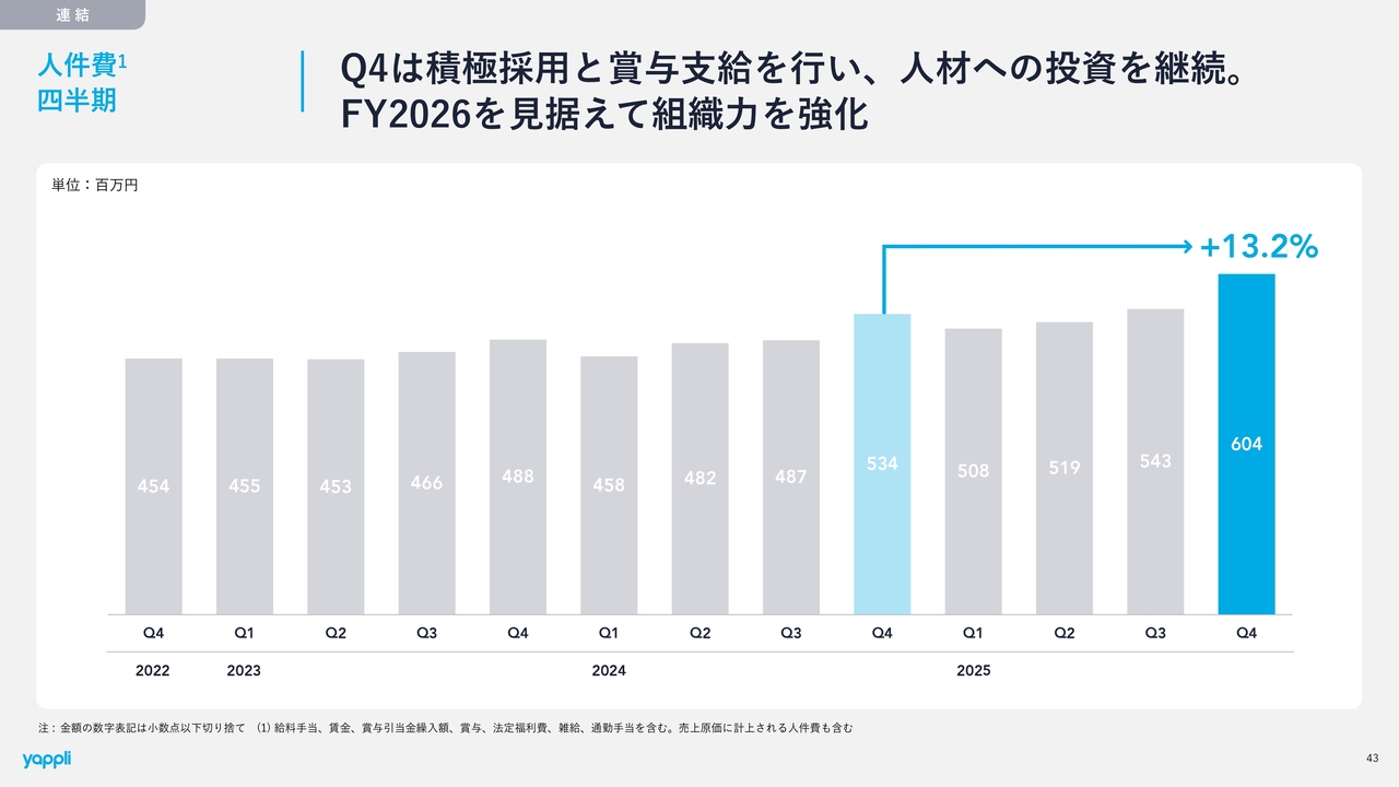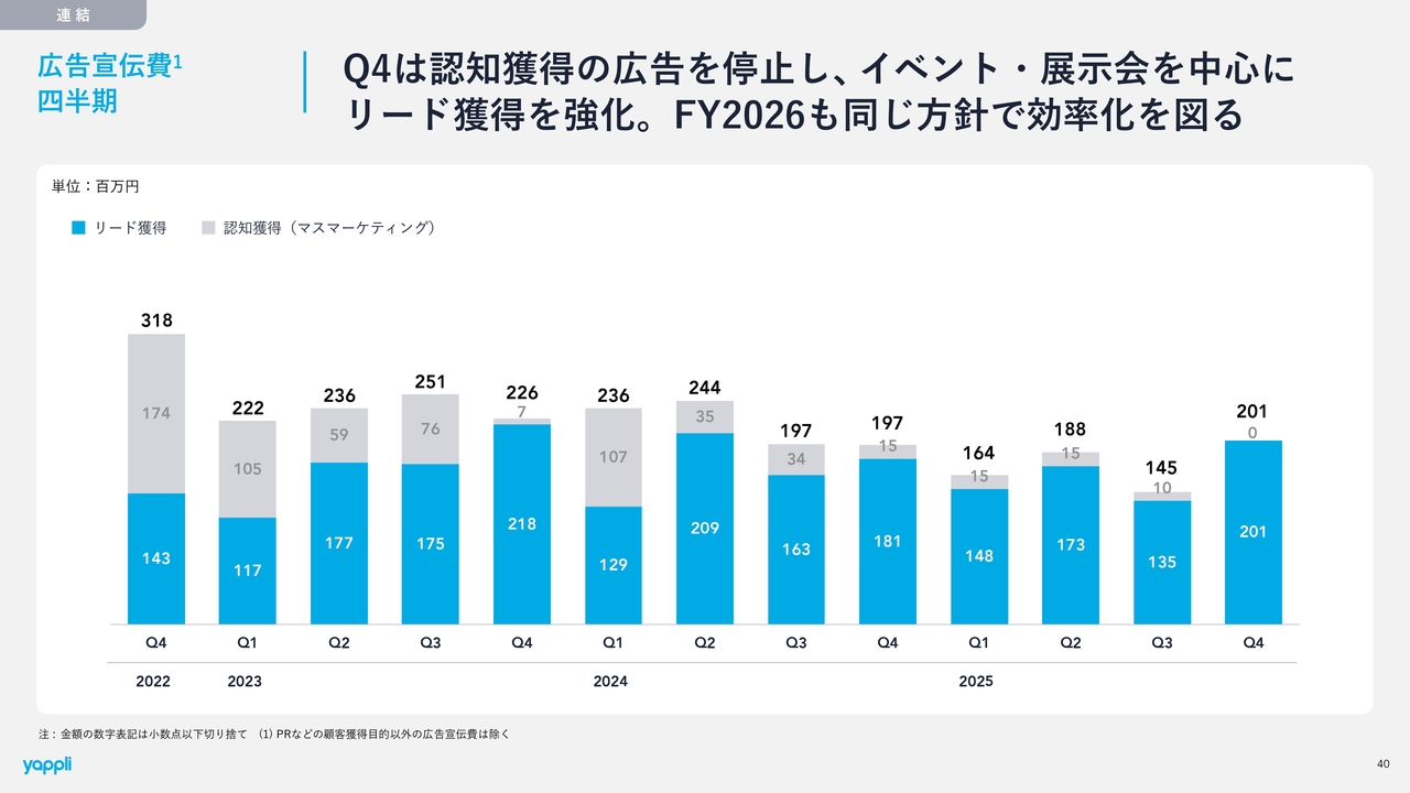 四半期別の広告宣伝費です。第4四半期は2026年に向けた投資を目的として、リード獲得を大幅に増やした四半期となっています。