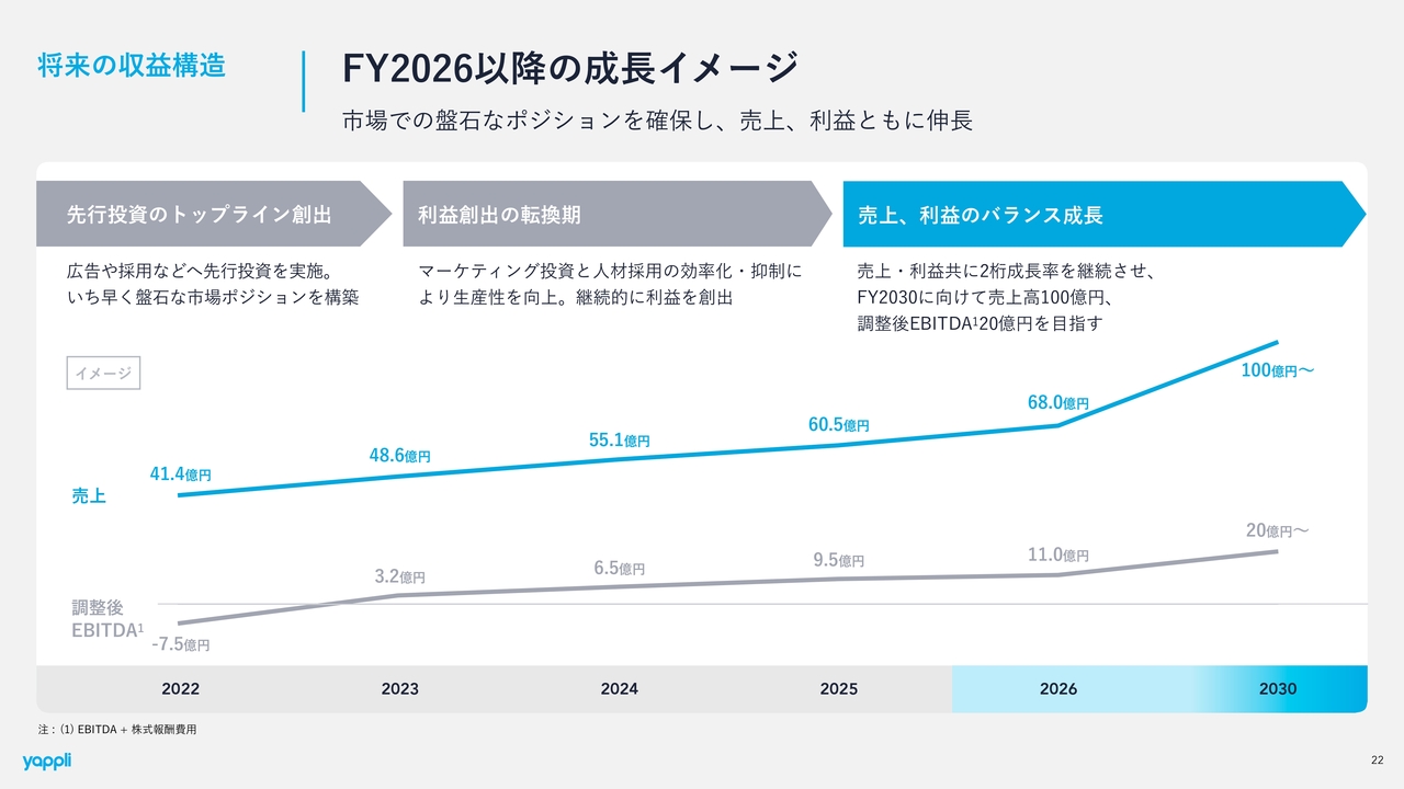 将来の収益構造は、本グラフのようなイメージを描いています。2026年の業績予想として売上高68億円、調整後EBITDA11億円を掲げており、4年後の2030年までに売上高100億円、調整後EBITDA20億円を超える会社へと進化したいと考えています。
