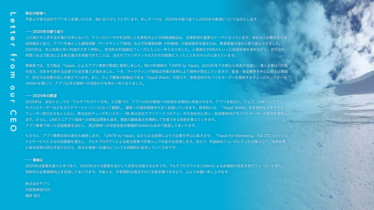 2026年も引き続き、株主のみなさまには株式会社ヤプリの成長を温かく見守っていただければと思います。